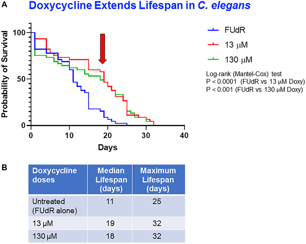 We have recently shown that combinations of low concentrations of doxycycline and azithromycin together with vitamin C effectively target and inhibit the propagation of breast cancer stem cells (BCSCs) which were: 1 μM doxycycline, 1 μM azithromycin and 250 μM vitamin C [34]. Here, we aimed to assess if the same combination was effective against aging in C. elegans, by prolonging its lifespan. We utilized the above agents at concentrations reported to efficiently inhibit MCF7 ER(+) breast cancer cells propagation (by >90%) [34].