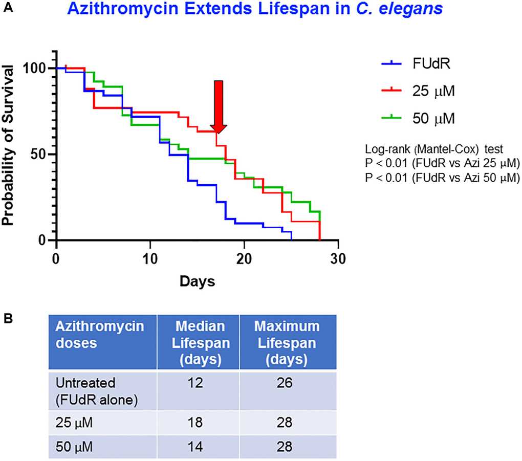 Another antibiotic, azithromycin that targets the mitochondrial ribosome machinery and inhibits mitochondrial translation as an “off-target”, is evaluated herein as to its lifespan-mediating actions. Azithromycin is an FDA-approved antibiotic belonging to the class of erythromycins [41]. We tested azithromycin at two concentrations on worms, 25 μM and 50 μM that translated in clinical practice as 18.72 μg/ml and 37.44 μg/ml, respectively (higher than the achievable concentration in patient’s serum upon oral azithromycin 500 mg: 0.39 μg/ml [44]). Azithromycin, especially at the lower concentration used, was capable of significantly extending the worms lifespan. Our data on both antibiotics are consistent with previously reported data by our group, demonstrating their capacity to interfere with the mitochondrial biogenesis in CSCs of various origin [41]. Indeed, Azithromycin was also shown by our group to selectively eliminate senescent cells, thus functioning as a clinically approved drug, with senolytic properties [45].