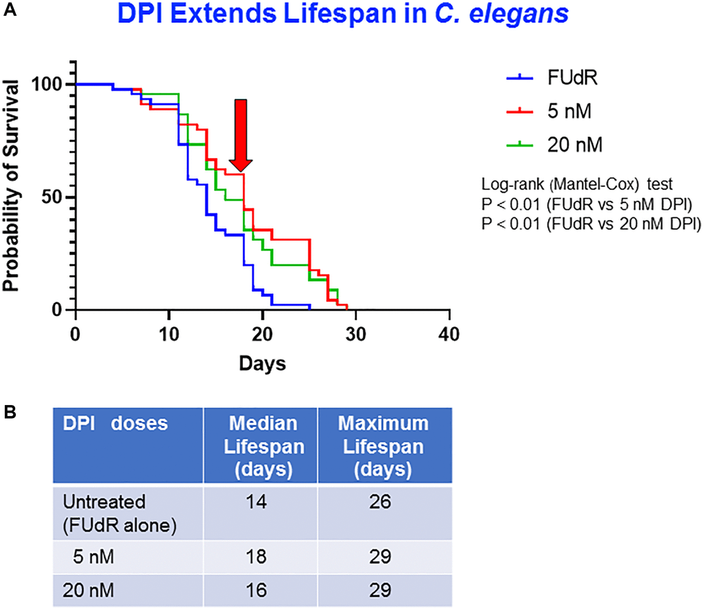 As to C. elegans studies in this matter, since DPI inhibits oxidative damage in the worms, it was also shown to reduce accumulation of the age pigment, lipofuscin in C. elegans, indicative of increased longevity [47]. However in the latter study, C. elegans fed on E. feacalis, a pathogenic bacterium that induces the worm killing, exhibited a reduced lifespan upon its treatment with DPI probably due to the fact that DPI interfered with the worm oxidative anti-bacterial defense mechanisms increasing its sensitivity to the pathogenic bacteria [47]. In contrast with these results, but consistent with our data, recent results showed that DPI can function as a senomorphic drug, reducing the number of beta-gal positive senescent cells in vitro. More importantly, DPI treatment of old mice decreased the number of senescent cells, reduced the expression of inflammatory mediators and ameliorated signs of aging, such as liver fibrosis and immune cell infiltration, and improved physical performance [48]. Overall, these data support the idea that DPI can extend lifespan and reverse aging in mammalians as well as C. elegans. All of these data are coherent with the well-established longevity-promoting effects of anti-oxidants, decreasing the production of oxygen free radicals and other reactive oxygen species (ROS) and abrogating their deleterious effect on cell survival [49, 50]. Interestingly, the protective effect we observed for DPI against aging was obtained at very low concentrations thus with little if any toxicity produced, an added value to its lifespan-increasing function.