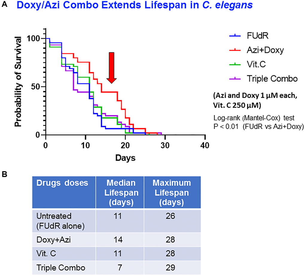 Worms were divided into four groups: 1) control worms; 2) worms treated with the combination of 1 μM doxycycline and 1 μM azithromycin; 3) worms treated with 250 μM vitamin C alone; and 4) worms treated with the triple combination of 1 μM doxycycline, 1 μM azithromycin and 250 μM vitamin C (Figure 4A). Results show that a significant survival (27% lifespan increase) was only observed in the group of worms treated with the combination of antibiotics (doxycycline and azithromycin), group 2, compared to controls (median lifespans: group 1 = 11 days; group 2 = 14 days, group 3 = 11 days and group 4 = 7 days) (Figure 4B).