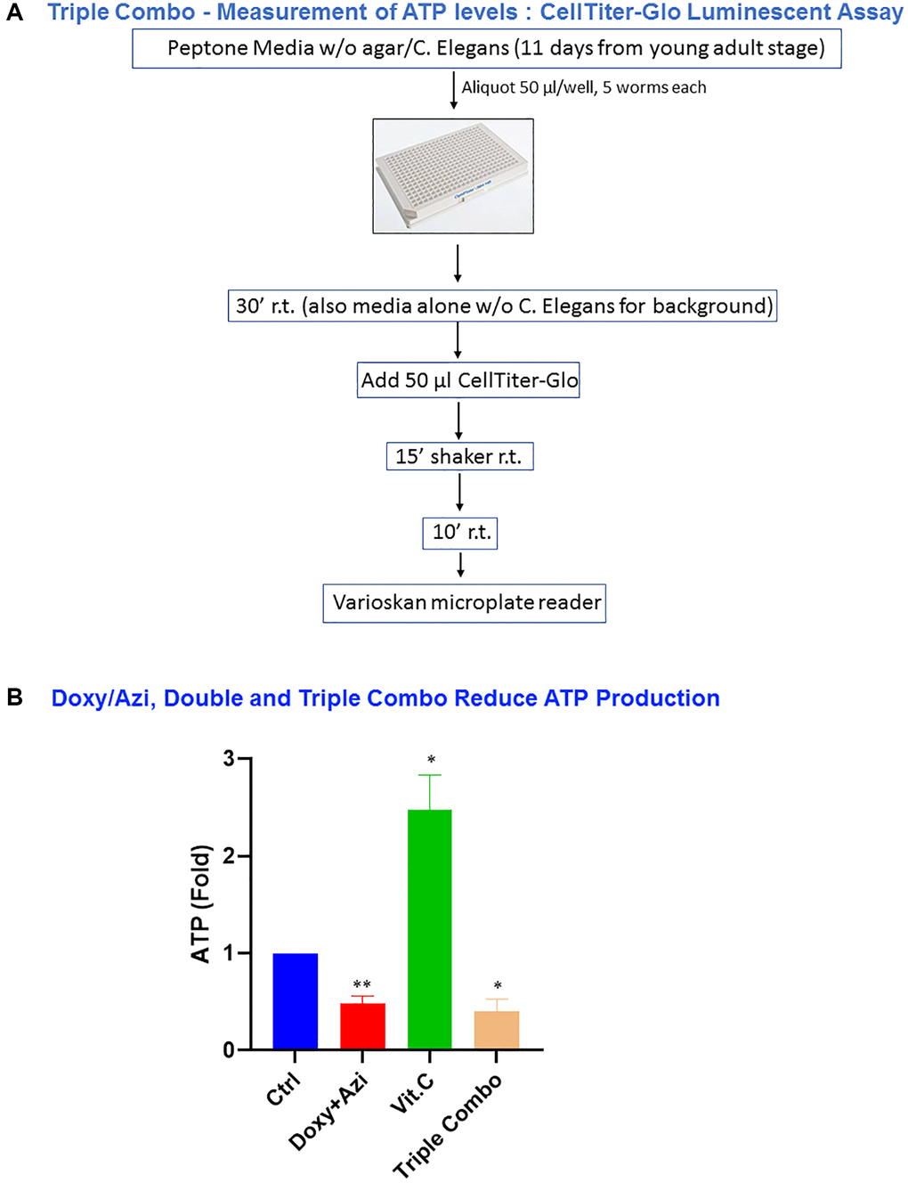To characterize the mechanism by which mitochondrial inhibitors extend lifespan, we measured the levels of ATP content upon treating worms with the various combinations of antibiotics and vitamin C. To this aim, we modified the protocol of the CellTiter-Glo assay generally used as ATP-based cell viability assay, as schematized in Figure 5A (see Materials and Methods for detailed description). The CellTiter-Glo assay is based on the quantification of ATP content, reflecting metabolically active cells. Intriguingly, the double combination (doxycycline plus azithromycin), as well as the triple combination (doxycycline plus azithromycin plus vitamin C) were significantly effective in decreasing the ATP levels by 50%, as compared to controls. Conversely, vitamin C alone, which is a known pro-oxidant, caused a significant increase in the production of ATP of more than 2.5 fold (Figure 5B).