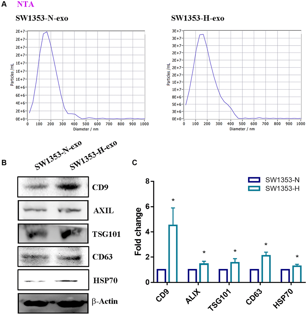 SW1353 cells were seeded at a density of 2 × 106 cells per dish in 100 mm culture dishes. After reaching 90% confluence, the cells were incubated for 24 hours in a serum-free culture medium. Subsequently, under either hypoxic conditions (1% O2) or normal oxygen levels (20% O2), the serum culture medium was replaced and incubated for an additional 48 hours. Following the manufacturer’s instructions, extracellular vesicles were purified from the cell culture using the total exosome isolation reagent (from cell culture media) (Catalog No: 4478359) obtained from Life Technologies. The steps are as follows: Transfer the required volume of cell-free culture medium to a new tube and add 0.5 volumes of total extracellular vesicle isolation reagent. Incubate overnight at 2°C to 8°C. Centrifuge at 10,000 × g for 1 hour at 2°C to 8°C and remove the supernatant. Extracellular vesicles are contained in the pellet at the bottom of the tube (usually not visible). Resuspend the pellet in an appropriate volume of 1X PBS or a similar buffer and store at −80°C.