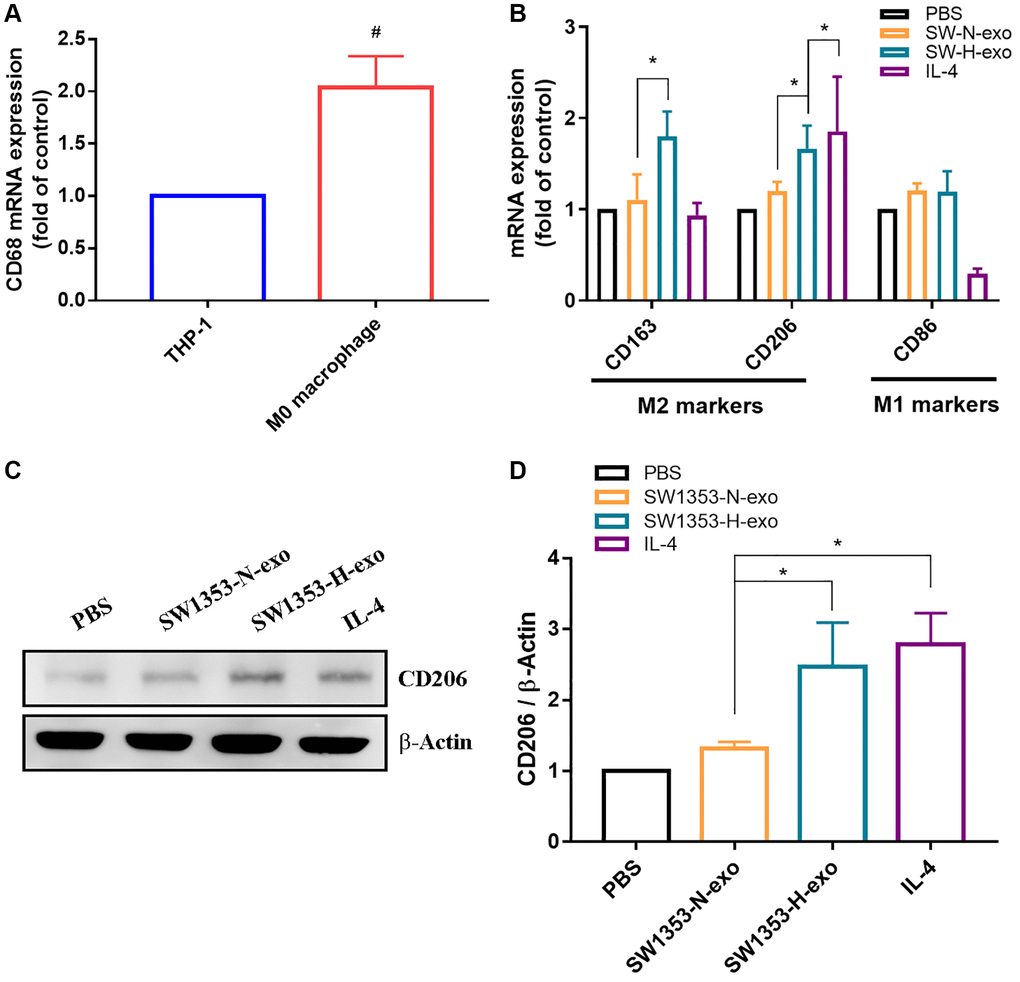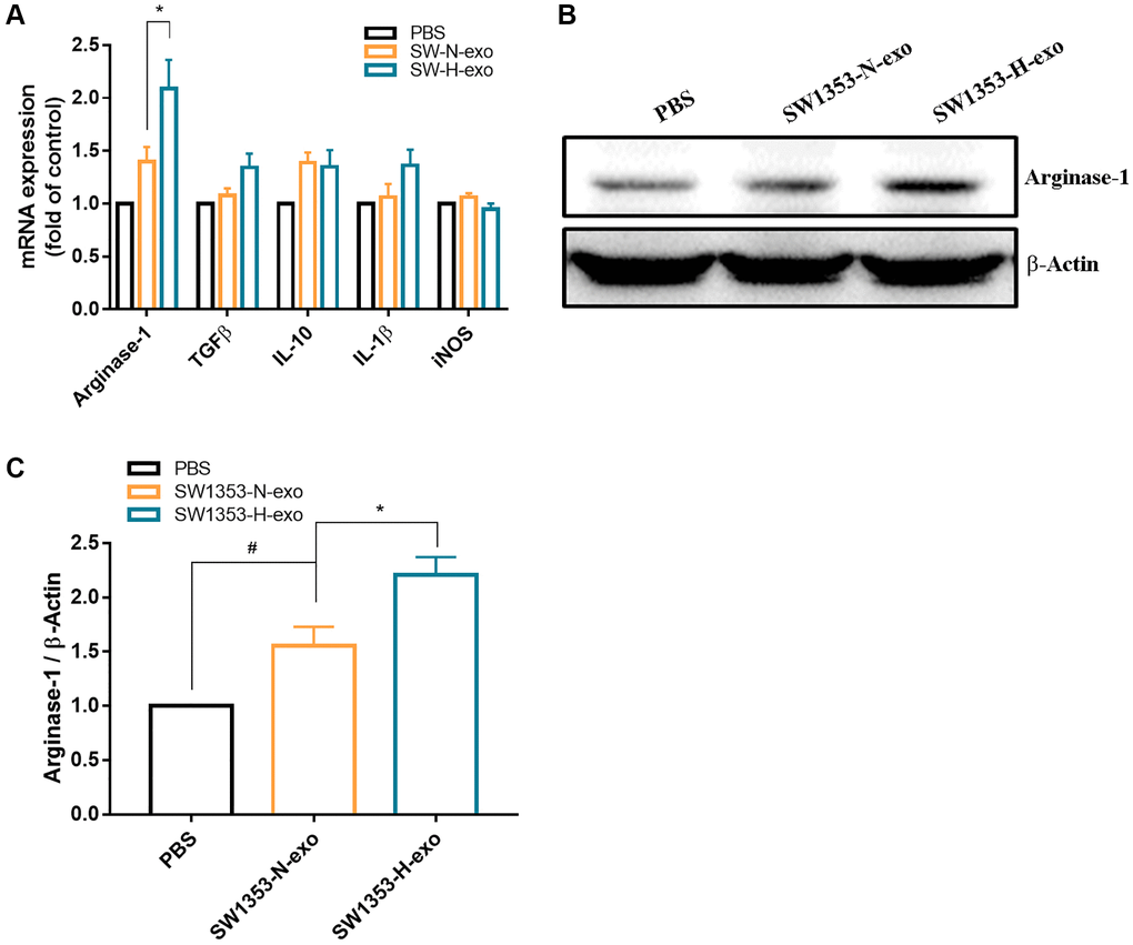 Hypoxia is a crucial characteristic of solid tumors, and secreted exosomes are known to deliver biological information to proximal or distal cells. Given that macrophages represent the predominant immune-related stromal cells within and surrounding tumors, our study aimed to explore the impact of hypoxic tumor-derived exosomes on macrophage polarization. To initiate this study, human THP-1 monocytes were treated with PMA (40 ng/mL) for 24 hours to induce macrophage differentiation, as shown in Figure 2A. Macrophages are characterized by their adherent morphology and expression of CD68. After confirming the differentiation of THP-1 into macrophages, we administered exosomes collected from SW1353 cells (under normal oxygen and hypoxia conditions) or performed PBS stimulation. The results showed that the expression levels of M2 surface markers including CD206 and CD163 induced by hypoxic exosome, IL-4 as positive controls, while the expression of the M1 surface marker (CD86) remained unchanged (Figure 2B–2D). Furthermore, in macrophages treated with SW1353-H-exo, levels of M2 intracellular marker (arginase-1) expression were increased, whereas no changes occurred in M1 surface marker (CD86) expression, M1 or M2 cytokine secretion (transforming growth factor beta [TGF-β], IL-10, IL-1β, iNOS) (Figure 3A–3C). Thus, hypoxia enhances exosome secretion from chondrosarcoma cells and activates macrophages towards the M2 phenotype.