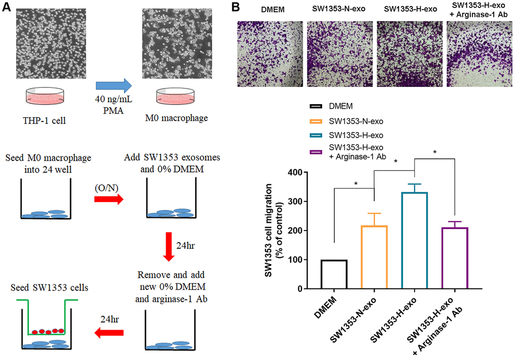 Subsequently, we proceeded to examine the influence of hypoxic chondrosarcoma cell-derived exosome-induced M2 macrophages on chondrosarcoma cell migration using an indirect co-culture system in vitro (Figure 4A). In the migratory Transwell assays, chondrosarcoma cell migration was significantly enhanced by M2 macrophages stimulated by hypoxic tumor-derived exosomes compared with normoxic exosomes (Figure 4B), pretreatment with M2 macrophages cell with Arginase-1 antibody significantly inhibited chondrosarcoma cell migration (Figure 4B). These findings suggest that hypoxia-induced exosomes activate M2 macrophages, which in turn promote chondrosarcoma cell migration.