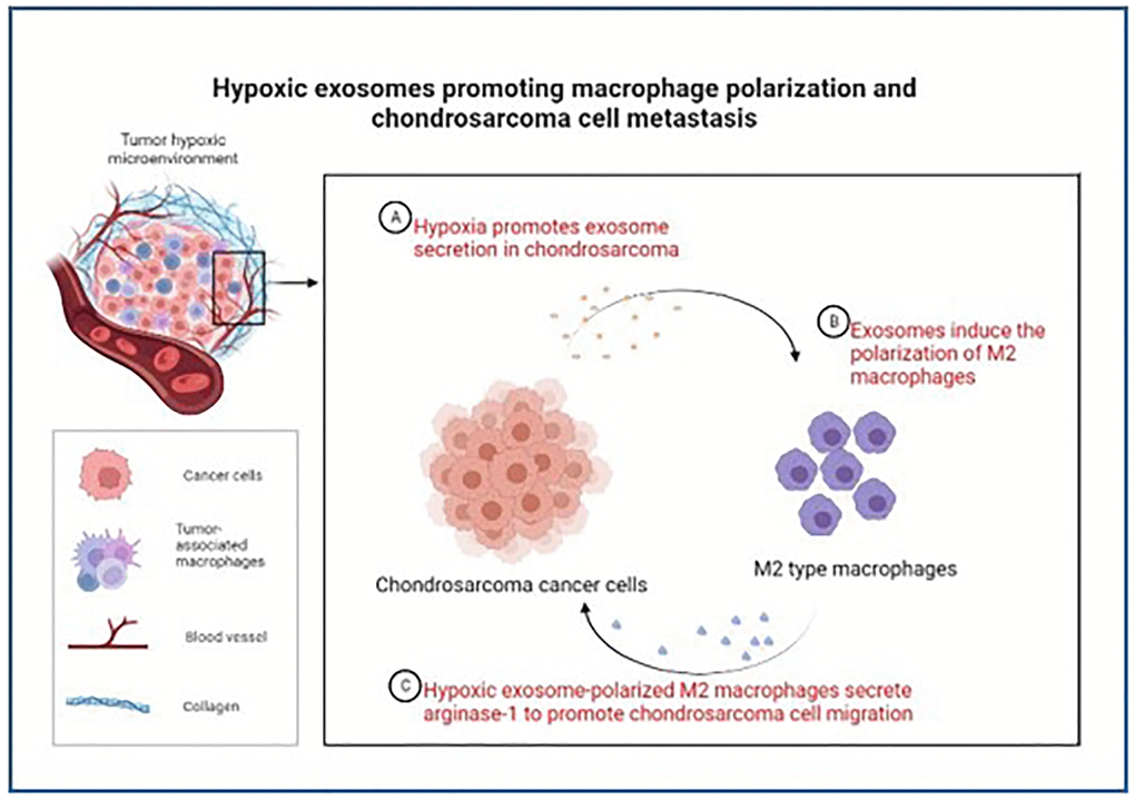 In conclusion, our study demonstrates that exosomes released by hypoxic chondrosarcoma cells play an important role in polarizing macrophages to the M2 phenotype, and that polarized M2 macrophages express arginase-1 feedback to chondrosarcoma cells, ultimately promoting the migration of chondrosarcoma cells (Figure 5). These findings shed new light on the contribution of hypoxia-derived exosomes to the advancement of chondrosarcoma and highlight the potential of targeting exosomes as a therapeutic strategy for this disease. By interfering with the release or function of these exosomes, it may be possible to disrupt the M2 polarization of macrophages and impede the aggressive behavior of chondrosarcoma cells. Further research in this direction may offer valuable insights and potential therapeutic avenues for managing chondrosarcoma.