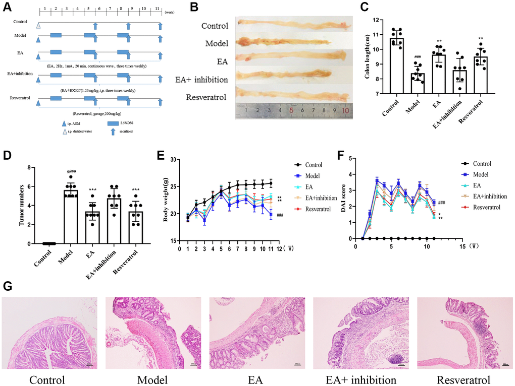 The mice were stratified randomly into the following five groups (20 mice per group): control group, model group, EA group (EA group), EA + SIRT1 inhibitor group (EA + inhibition group), and SIRT1 agonist resveratrol group (resveratrol group). With the exception of the normal group mice, mice in other groups were given a single injection of AOM (10 mg/kg in PBS; i.p.; A5486, Sigma-Aldrich, St. Louis, MO, USA). After one week of rest, all the mice were administered with 2.5% DSS (02160110, MP Biomedicals, Santa Ana, CA, USA) added to their drinking water for one week, followed by DSS-free water for two weeks. The DSS treatment cycle was repeated three times, and the mice were subjected to the interventions simultaneously.