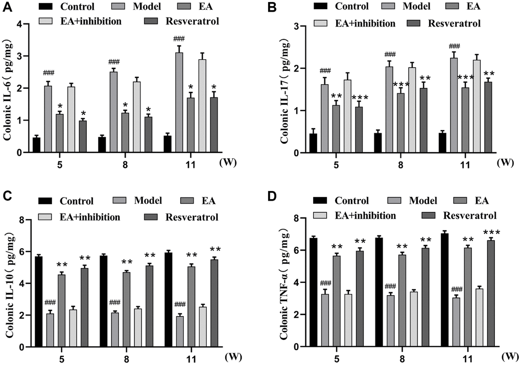 Chronic inflammation has been shown to promote of colitis-induced colon carcinogenesis. IL-6 and IL-17 are proinflammatory cytokines whereas IL-10 and TNF-α are anti-inflammatory cytokines that regulate the development of CRC. Therefore, we investigated that EA inhibited CRC by augmenting the anti-inflammation. Changes in cytokine levels in colonic tissues were measured with ELISA kits. As is shown in Figure 2, inflammation level was lower in the control group compared to the model group (p < 0.001). The expression of IL-6 and IL-17 (Figure 2A, 2B) in the EA group and resveratrol group was significantly lower compared to that in the model group, while the expression of IL-10 and TNF-α (Figure 2C, 2D) in the EA group and resveratrol group was significantly higher compared with that in the model group. The levels inflammation in EA + inhibition group was slightly lower related to that of the model group, but the difference was not significant (p > 0.05).