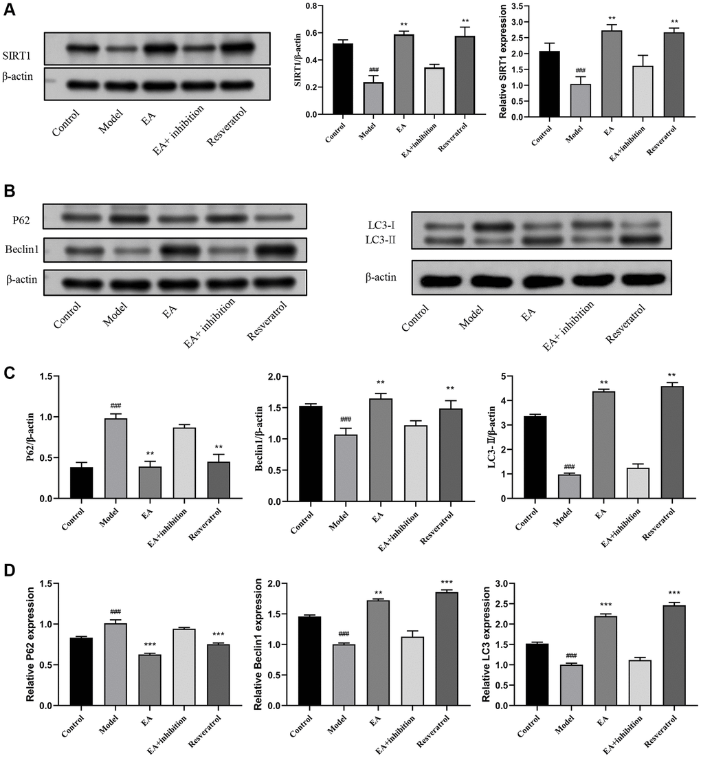 After confirming the role of EA in regulating autophagy at the protein level, we further verified it at the tissue level. As shown in Supplementary Figure 1, after EA treatment, the expression of Beclin1 (p < 0.001) and LC3 (p < 0.001) was increased, and the expression of P62 (p < 0.01) was decreased. Application of the SIRT1 agonist resveratrol synergized the effect of EA to enhance the occurrence of autophagy (Supplementary Figure 1).
