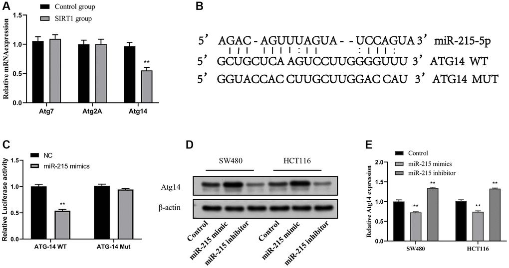 To elucidate the mechanism of miR-215 promoting autophagy, we found that there are three kinds of ATGs (Atg7, Atg2A and Atg14) that may bind to it, through the online prediction software TargetScan and RNAhybrid (Figure 5A). The results of RT-qPCR experiment indicated that Atg14 showed a high expression trend after resveratrol and overexpression of SIRT1 plasmid. To investigate the binding between miR-215 and Atg14, we utilized a luciferase reporter plasmid with both wild-type and mutated docking sites (Figure 5B). To further evaluate whether Atg14 is the direct target of miR-215, pmiR-RB-ReportTM-WT-Atg14 and pmiR-RB-ReportTM-MUT- Atg14 were co-transfected with miR-215 mimic or inhibitor into SW480 and HCT116 cells. After treatment with miR-215 mimic, the relative luciferase activity in the reporter with wild type 3′UTR of Atg14 but not in the reporter harboring a mutated miR-215 binding site in the 3′UTR of Atg14 was significantly attenuated (Figure 5C). Western blotting and RT-qPCR experiments revealed that the expression of Atg14 protein (Figure 5D) and mRNA (Figure 5E) was significantly decreased in CRC cells following miR-215 mimic transfection, but it was up-regulated after miR-215 inhibitor transfection (Figure 5D, 5E). Meanwhile, we also examined the effects of EA on miR-215 and Atg14 in mouse colon tissue and found that EA and resveratrol inhibited miR-215 expression and promoted Atg14 expression, whereas EA + inhibitor showed no significant changes (Supplementary Figure 2).