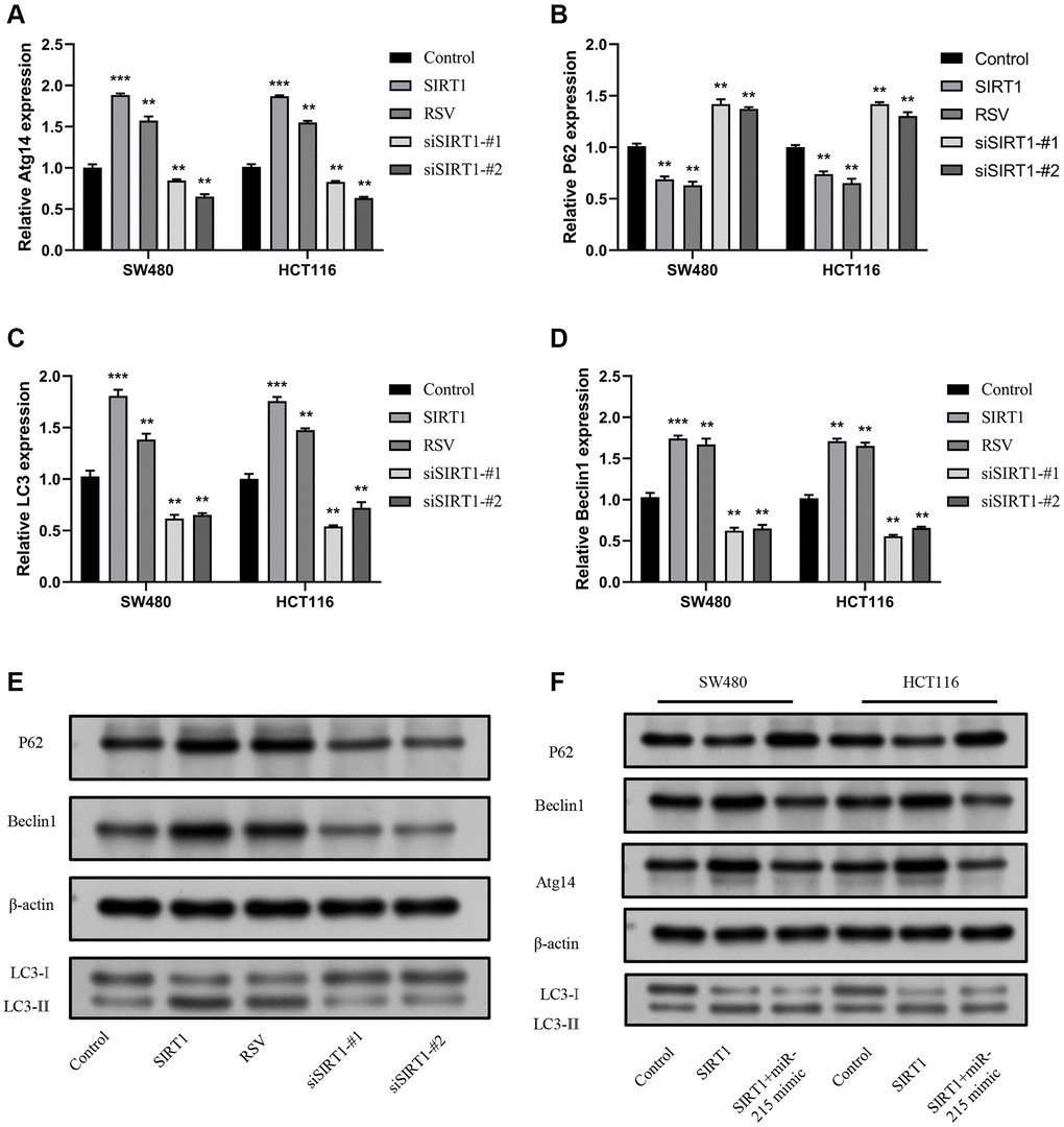 To explore the effect of SIRT1/miR-215/Atg14 axis on autophagy in CRC, the mRNA expression level of Atg14 was measured by RT-qPCR in SW480 and HCT116 cells after overexpression or knockdown of SIRT1. Results indicated that overexpression of SIRT1 increased Atg14 expression, while knockdown of SIRT1 decreased Atg14 expression (Figure 6A). Furthermore, the expression of autophagy- related molecule P62, Beclin1 and LC3 was detected. The findings indicated that overexpression of SIRT1 led to increased levels of Beclin1 and LC3, while P62 expression decreased. Conversely, when SIRT1 was knocked down, a statistically significant difference was observed (Figure 6B–6D). The same trends were observed by Western blot analysis (Figure 6E). Furthermore, we also performed the rescue experiment in vitro. In SW480, as well as HCT116 cells, the autophagy level of SIRT1 + miR-215 mimic group was lower in contrast with that of SIRT1 overexpression group, but higher in contrast with that of control group (Figure 6F). Overexpression of miR-215 expression remarkably inhibited the autophagy-induced effects on SIRT1. In summary, these results illustrate that the SIRT1/miR-215/Atg14 axis plays an important role in occurrence of autophagy in CRC.