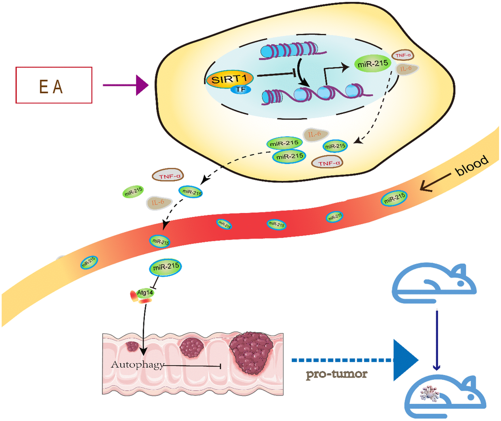The data shown in the graphical abstract (Figure 7) demonstrates that EA activates SIRT1 to inhibit miR-215 and restore Atg14 expression. Through this mechanism, SIRT1 promotes autophagy and inhibits CRC. These results demonstrate that EA activates autophagy of CRC cells via the SIRT1/miR-215/Atg14 axis. Thus, it is a potential target for the treatment of CRC.