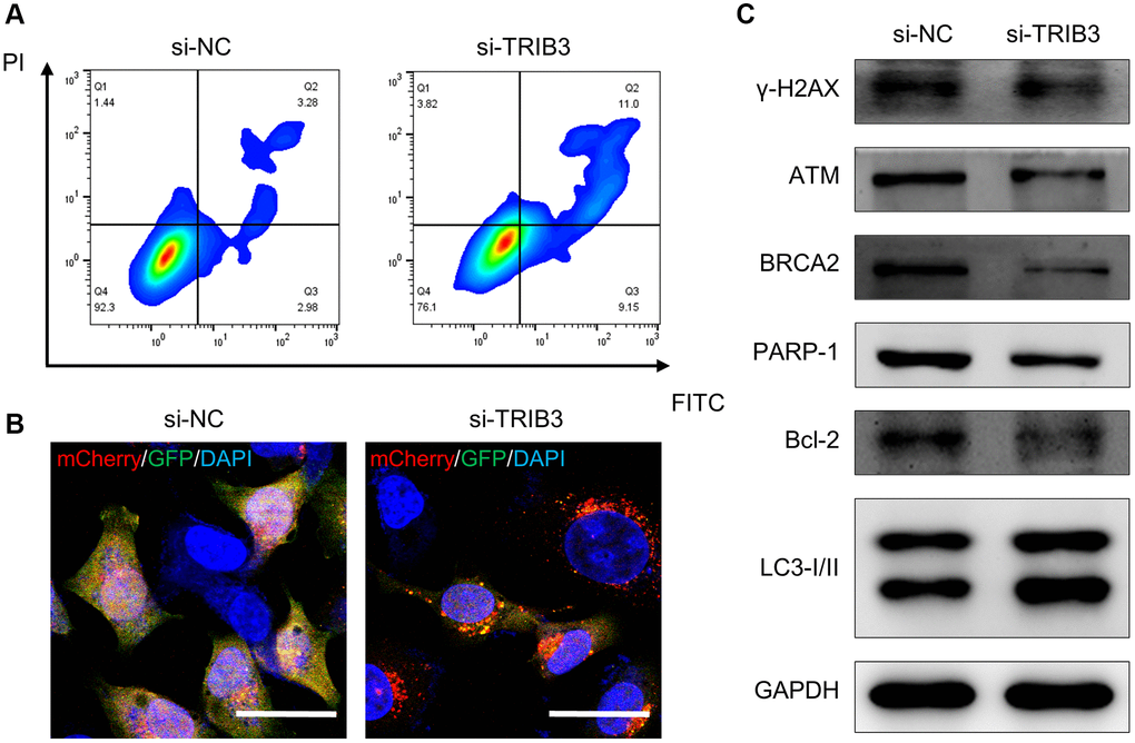 Here, we found that tumor tissues had a significantly higher TRIB3 expression level than normal tissues (Figure 9A). To validate the differential expression of TRIB3, we used HK-2 (an immortalized proximal tubule epithelial cell line from a normal adult human kidney) and A498 (a cell line with epithelial morphology that was isolated from a kidney cancer patient) cells for exploration. Similarly, elevated expression of TRIB3 was observed in A498 cell line as compared to the expression in HK-2 cell line (Figure 9B). Si-NC- or si-TRIB3-transfected A498 cells were selected to further explore the role of TRIB3 on KIRC. The knockdown of TRIB3 in A498 cells was verified by western blot (Figure 9C). Subsequently, we comprehensively explored the influence of TRIB3 on tumor growth and development by conducting cell viability assays, assessment of cell proliferation and migration capacity and colony formation experiments. Compared with the si-NC group, A498 cells with lower TRIB3 expression exhibited much poorer cell viability at different time points (24 h, 48 h and 72 h post transfection) (Figure 9D), and the proliferation ability, colony formation potential and migration capacity were weakened in the si-TRIB3 group (Figure 9E–9I), which was consistent with the finding that TRIB3 positively affects cell proliferation and invasion in RCC cells, implying that TRIB3 is a tumor-promoting factor in KIRC. To our knowledge, TRIB3 is a key gene in both apoptosis and cellular autophagy processes (Supplementary Table 1). The apoptosis rate of A498 cells was increased from ~6.26% to ~20.15% after transfected with siRNA against TRIB3 (Figure 10A) and bcl-2 expression in A498 cells was downregulated with the knockdown of TRIB3 (Figure 10C), which meant that TRIB3 inhibited the apoptosis process in KIRC. Meanwhile, the elevated autophagic level was characterized by an increased number of red puncta and a decreased number of green puncta in A498 mCherry-GFP-LC3 cells (Figure 10B) and the ratio of LC3II/I was increased in the si-TRIB3 group (Figure 10C). Furthermore, TRIB3 is highly positively correlated with DNA repair (Figure 7A) and severe DNA damage can initiate the apoptotic pathway and ultimately induce cell death. Therefore, the expression of DNA repair-related proteins (γ-H2AX, ATM, BRCA2 and PARP-1) was further examined, showing that defective expression of TRIB3 downregulated the expression levels of these proteins (Figure 10C).