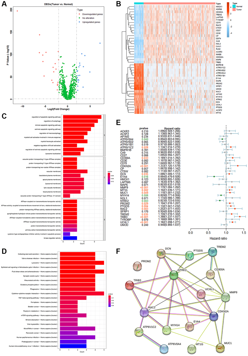 The workflow of this study is shown in Figure 1. First, we obtained 1257 protein coding genes related to PCD from previous studies [18] and the GSEA database, including apoptosis, autophagy, pyroptosis, ferroptosis, necroptosis, alkaliptosis, oxciptosis, parthanatos, anoikis, cuproptosis, entotic cell death, netotic cell death, and lysosome-dependent cell death (shown in Supplementary Table 1). Forty-one differentially expressed protein-coding genes (DEGs) were screened to significantly distinguish tumor tissues from normal tissues, covering 22 significantly upregulated genes in tumor tissues and 19 downregulated genes (Figure 2A, 2B and Supplementary Figure 1A). These genes were primarily enriched in the apoptosis, autophagy and lysosome pathways in renal tumor tissues. (Figure 2C, 2D). A total of 7.71% (31 in 402) of samples had somatic mutations in these genes (Supplementary Figure 1B). A change in copy number variation (CNV) was also observed in these genes (Supplementary Figure 1C). The surv_cutpoint R-function was adopted to determine the ideal cutoff of 41 DEGs expression and the Kaplan-Meier survival curve was further depicted. The results showed that 87.8% (36 in 41) of these genes had a significant correlation with the prognosis of KIRC patients; specifically, high expression of 11 genes (AP1M2, ATP6V0A4, ATP6V0D2, CA9, EYA4, HMOX1, MAP6, MYH14, NTRK2, SFRP1 and UMOD) contributed to favorable prognosis of KIRC patients, while the high expression of the other 25 genes (ACKR3, ACSF2, ATP6V1B1, ATP6V1C2, BMPR1B, CD27, CD300A, CD3E, CD70, CDKN2A, CP, CTSW, DCN, LAPTM5, MMP9, MT1G, MUC1, NOL3, PROM2, PTGDS, RAC2, TREM2, TRIB3, TYROBP and UCHL1) led to poor outcomes in patients (Supplementary Figure 2A). Furthermore, uni-Cox regression analysis among these 36 genes was conducted and the results demonstrated that 17 DEGs had significant correlations with OS (P < 0.05) of KIRC patients (Figure 2E), including 4 protective factors (HR <1) and 13 risk factors (HR >1), which were termed PRPCDGs. Meanwhile, multi-Cox regression analysis (adjusted by age, grade and stage) was performed and the results showed that TRIB3, ATP6V1C2, UCHL1, NTRK2 and MYH14 were the independent factors in KIRC (Supplementary Figure 2B). The PPI network of 17 PRPCDGs is presented in Figure 2F.