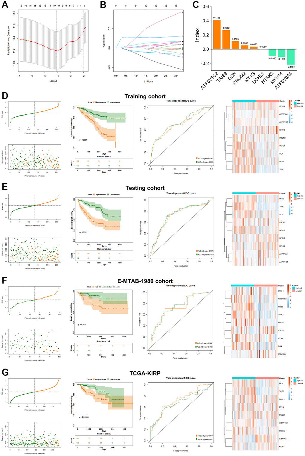Utilizing the createDataPartiton R-function, we separated the TCGA-KIRC dataset into training and testing cohorts at a ratio of 1:1. To construct the prognosis-related risk signature, the LASSO-penalized Cox (LASSO Cox) regression analysis was then conducted based on the glmnet R-package and 10-fold cross-validation in KIRC-training dataset. A 9-gene signature was finally determined. Gene expression and coefficients derived from LASSO Cox regression were used for the establishment of the formula for risk score computation.