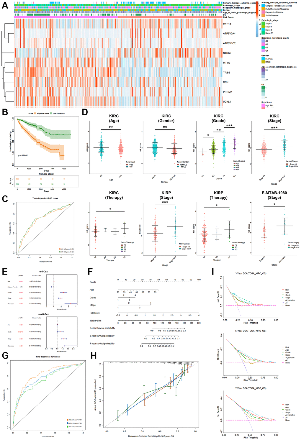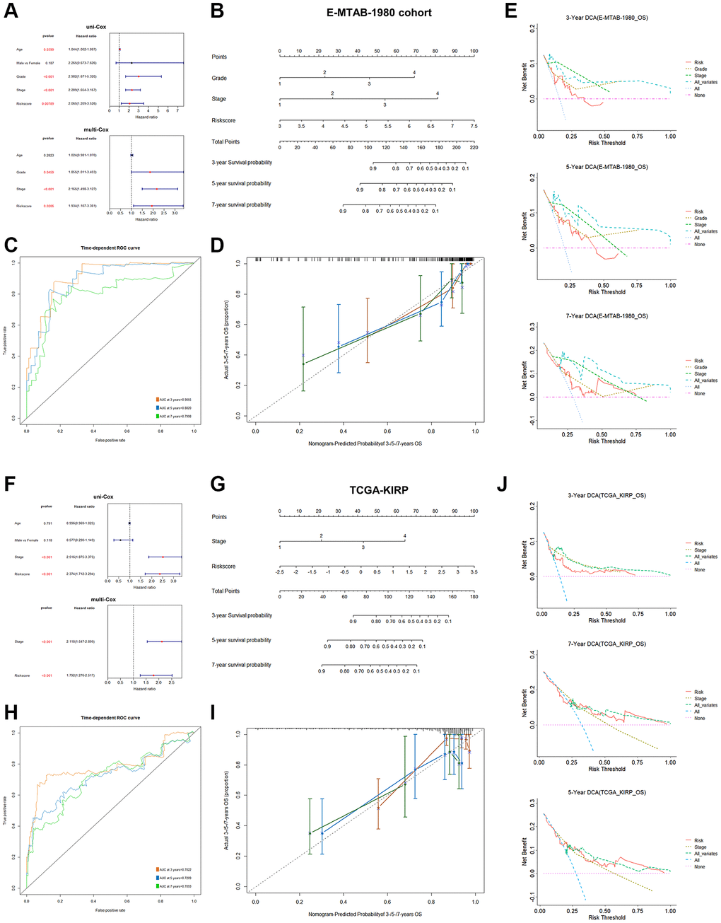 The clinical characteristics of KIRC patients were further analyzed based on these 9 PRPCDGs. In KIRC cohort, the differential expression and prognosis prediction performance of 9 PRPCDGs, and the survival difference corresponded with the results described previously (Figure 4A–4C). The correlations between risk scores and various patients’ clinical features were estimated (Figure 4D). The risk scores of KIRC patients did not differ significantly by age or gender, but they did have positive correlations with pathological grade and clinical stage. In addition, higher PRPCDGs risk scores were observed in patients with PD in the KIRC cohort, which suggested that PRPCDGs risk signature was capable of predicting the therapy response. Moreover, patients with the advanced clinical stage (Stage III/IV) in KIRP and E-MTAB-1980 datasets showed higher risk scores, and patients with PD in E-MTAB-1980 cohort represented high risk scores. Patients in KIRP and E-MTAB-1980 datasets with advanced clinical stages (Stage III/IV) displayed higher risk scores, and patients with PD from E-MTAB-1980 dataset reflected high risk scores. Uni- and multi-Cox regression analyses were carried out based on age, gender, grade, stage, and risk scores to further investigate independent predictive efficacy of PRPCDGs risk signature in KIRC cohort, revealing that the risk score was the independent prognostic factor for KIRC patients (Figure 4E). For the prediction of the likelihood of 3-/5-/7-year survival, a nomogram model was established with analysis of multi-Cox regression (Figure 4F). ROC and calibration curve analyses assessed the model’s accuracy (Figure 4G, 4H), and the DCA curves showed the highest clinical value for 5-/7-year prediction of patients’ prognosis in the model consisting by risk scores, age, grade and clinical stage (Figure 4I). A similar analysis for the PRPCDGs risk signature was conducted in E-MTAB-1980 cohort, indicating that the model (consisting of risk score, pathological grade and clinical stage) for 5-/7-year prognosis of patients possessed the best prediction value, further highlighting the ideal predictive efficacy of the model for patients’ prognosis (Figure 5A–5E). Similarly, the model consisting by risk score and clinical stage showed satisfactory prediction value for patients’ prognosis in TCGA-KIRP cohort (Figure 5F–5J), which indicated that the PRPCDGs signature could be universal in other RCC tumors.