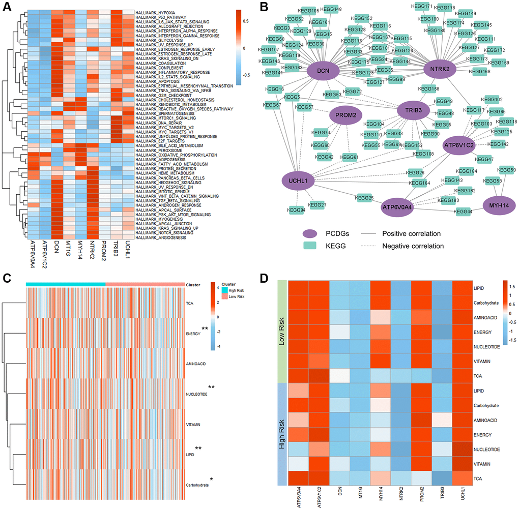To explore the cross-talk among these 9 PRPCDGs in KIRC, the expression of them was analyzed by the Pearson correlation coefficient (Supplementary Figure 4A). The results revealed that ATP6V0A4 positively correlated with ATP6V1C2, MYH14 and PROM2, and possessed a negative relation on TRIB3. ATP6V1C2 positively correlated with NTRK2. UCHL1 had a positive correlation with DCN and PROM2. To reveal the potential mechanisms of PRPCDGs in KIRC, the activity scores on KEGG pathways, various cancer-related hallmark pathways and GO terms (molecular functions, biological processes and cell components) and the PCCs of 9 PRPCDGs were computed. The correlations between 9 PRPCDGs and activity scores of cancer-related hallmark pathways are presented in Figure 7A, indicating that different genes responded to different pathways. The correlations with GO terms and KEGG pathways are depicted (Figure 7B and Supplementary Figure 4B–4D, detailed in Supplementary Tables 2–5). The results showed that DCN, NTRK2, TRIB3, ATP6V1C2, ATP6V0A4 and PROM2 had a strong correlation with multiple KEGG pathways, and DCN, UCHL1 and TRIB3 were highly correlated with various GO terms. Interestingly, the expression of DCN performed a strong correlation not with various KEGG pathways but with different GO terms, which meant that DCN possibly played a vital role in KIRC development. Moreover, in the high-PRPCDGs-risk group, metabolism-related pathways were highly enriched and the pathways of energy, nucleotide, lipid and carbohydrate had significantly higher activated levels (Figure 7C, 7D).