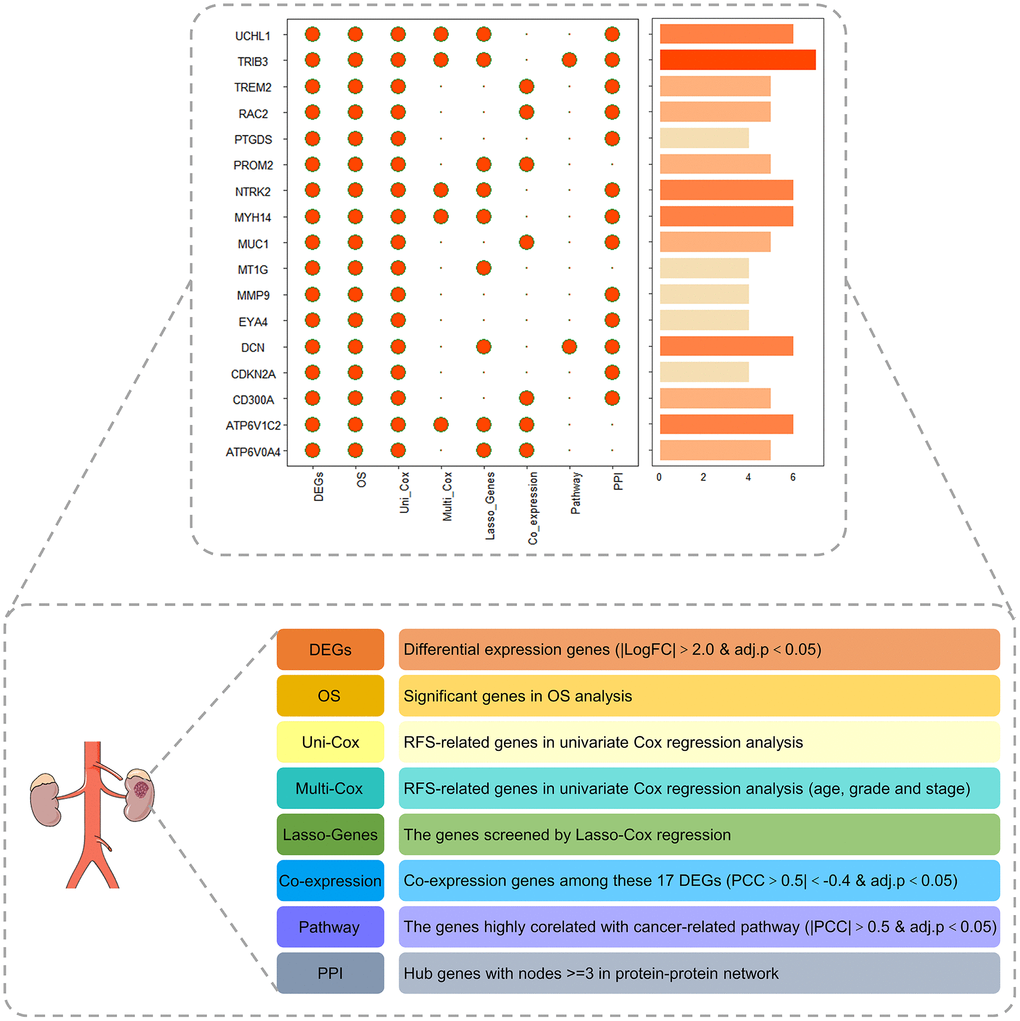 To validate the vital role of PRPCDGs in KIRC, eight indicators (DEGs, OS, uni-Cox, multi-Cox, Lasso-genes, Coexpression, Pathway and PPI) were chosen to construct the landscape map of these 17 PRPCDGs, and the scores of these genes were calculated (Figure 8). According to the landscape map, we found that the TRIB3 got the highest score. Therefore, the vital role of TRIB3 in KIRC was further investigated in our study. TRIB3 (Tribbles Pseudokinase 3) is a protein-coding gene in humans. The finding that TRIB3 is highly expressed in RCC has been confirmed in several studies, and the elevated TRIB3 expression in RCC patients is correlated with clinicopathologic features (e.g., tumor grade and stage) of the tumor and prognosis [19].