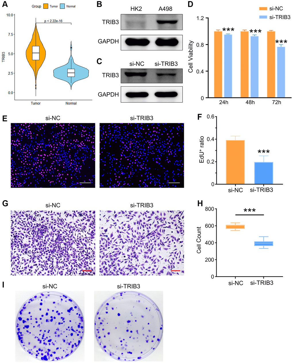 After the transfection of si-TRIB3 and si-NC, A498 cells were plated into the confocal dishes, 6-cm cell culture dishes and chambers of cell culture inserts. Click-iT EdU cell proliferation assay (Thermo Fisher Scientific, USA) was used for cell proliferation test and a laser confocal microscope was used for the observation of cells. For the clone and invasion assay, cells were stained with crystal violet ammonium oxalate solution (Solarbio, China). The culture dishes were imaged and the chambers were observed via microscopy.