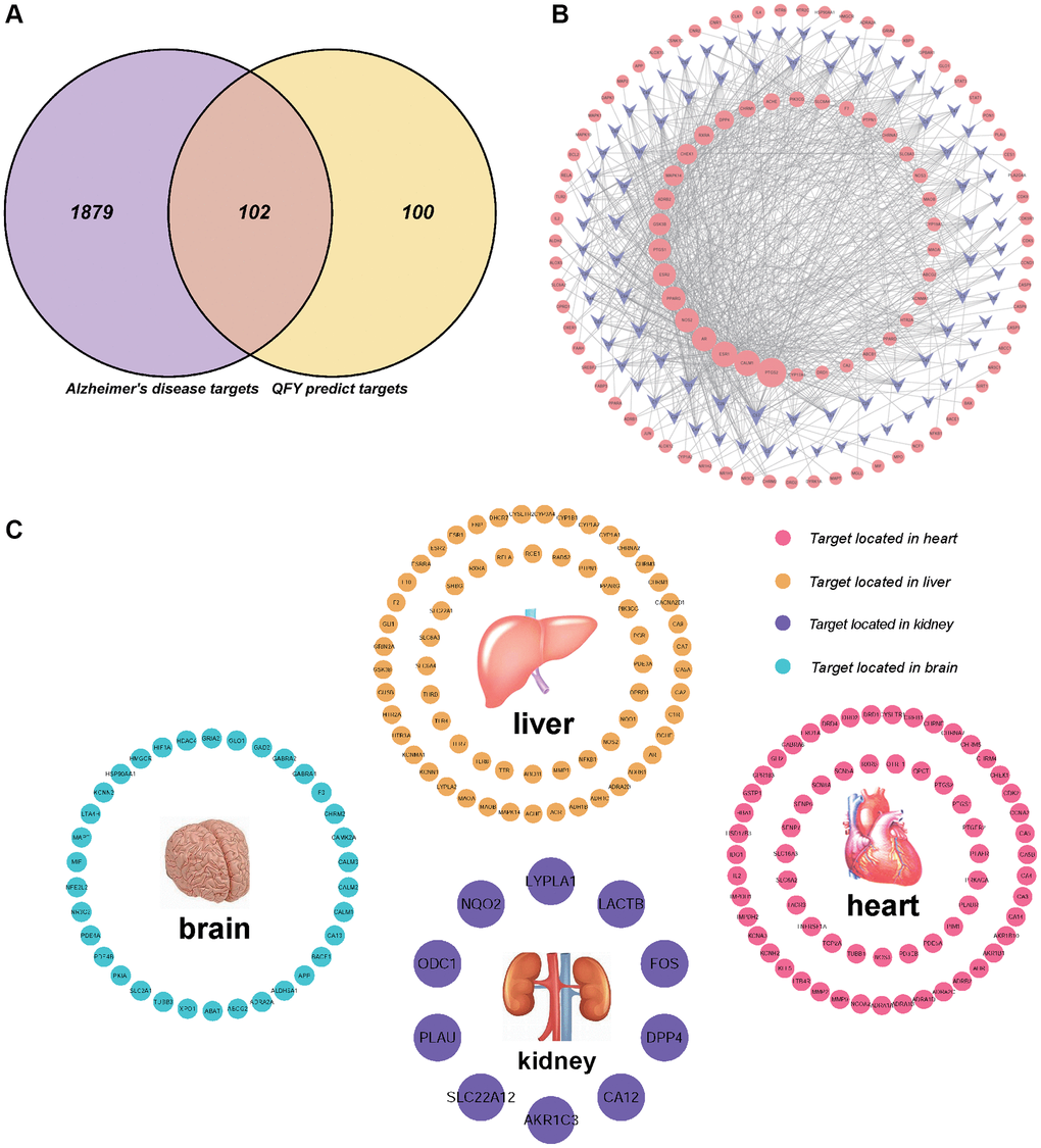 A target-organ localization network between the screened targets and 84 organs in the human body was established to investigate the potential organ targets of QFY. The results showed that the lungs, heart, liver, kidneys, brain, and blood were the main organs associated with the potential drug targets of QFY. Interestingly, the targets of QFY are located highly not only in the brain but also in other organs, especially the liver and blood, which may be related to drug absorption, metabolism, and clearance. Therefore, it is necessary to consider the comprehensive effects of QFY on multiple organs and systems when developing therapeutic strategies for the treatment of AD.