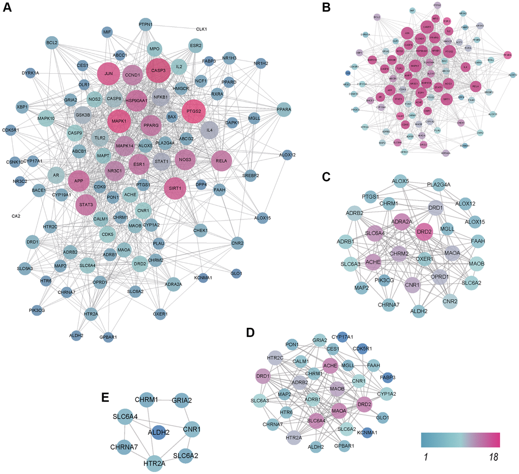 To gain insights into the potential PPI of the predicted targets of QFY for treating AD, we utilized the STRING online database [23]. Using a screening threshold score of 0.9, we constructed the PPI network using Cytoscape 3.7.1. Further, we carried out a Cluster module analysis to identify the potential cluster modules and gain insights into the molecular mechanisms underlying its therapeutic effects by using the Cytoscape MCODE plug-in.