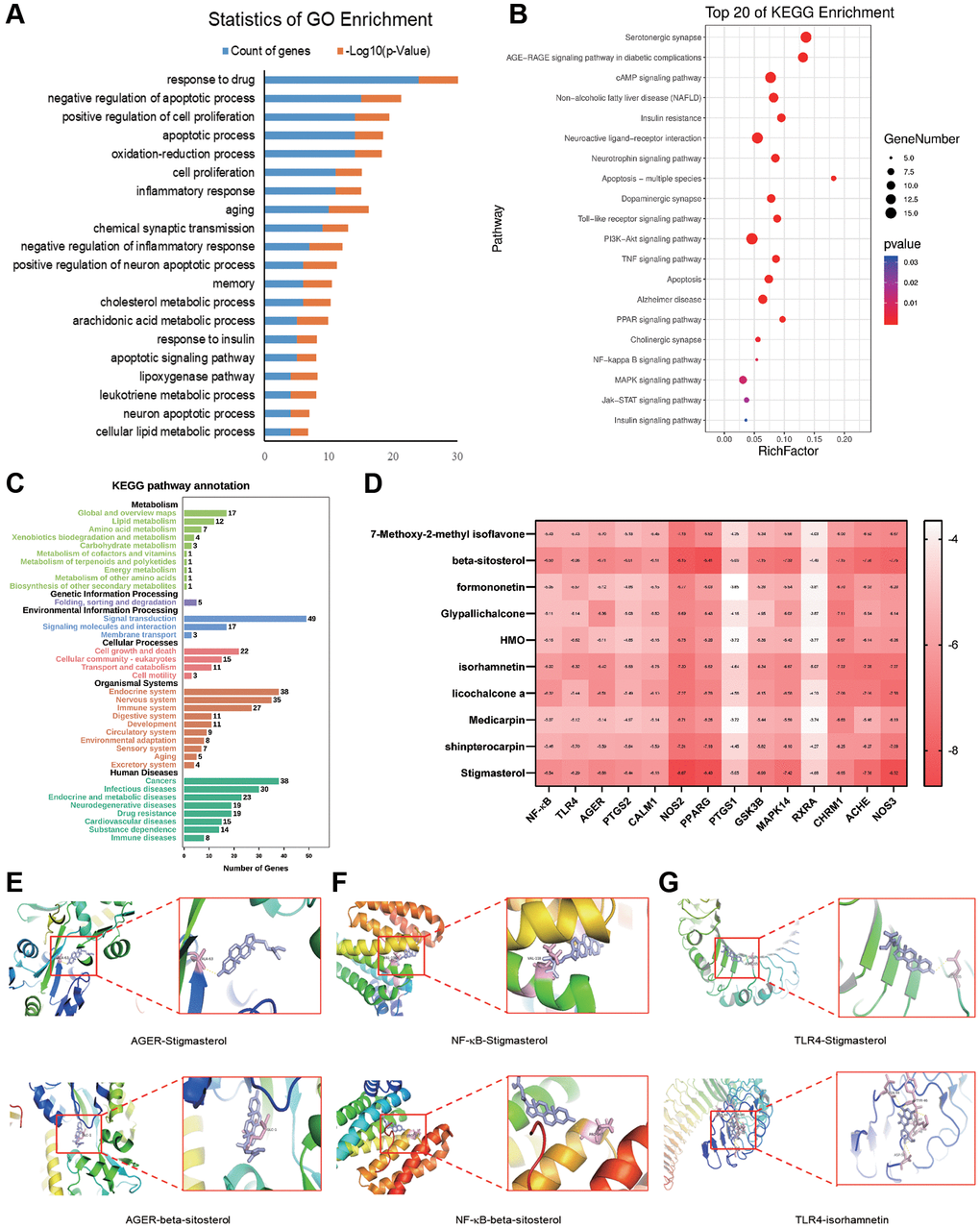 Our results revealed a total of 203 potential targets among 87 active compounds in QFY, with each compound having approximately 45 targets. The results demonstrate that the treatment effect of QFY on AD is likely due to its combined effect on multiple targets, highlighting its potential as a possible therapeutic strategy for treating AD. In our network pharmacology analysis, we identified 102 potential targets related to AD from among 87 compounds in QFY. Notably, isorhamnetin, formononetin, 7-methoxy-2-methyl isoflavone, stigmasterol, and β-sitosterol were among the main active compounds in QFY, with a higher number of predicted targets. This suggests that these compounds may play a crucial role in the pharmacological action of QFY in the treatment of AD. Isorhamnetin alleviates inflammatory response and apoptosis through the Akt/SIRT1/Nrf2/HO-1 signaling pathway [35], regulates apoptosis and autophagy through the P38/PPAR-α pathway [36], and protects against Aβ-induced cytotoxicity and Aβ aggregation [37]. Formononetin has been found to have potential benefits in protecting against AD and regulating vascular inflammation in AD through the Nrf2 pathways [38]. It also has a neuroprotective effect and can improve learning and memory in a mouse model of AD [39]. Further, it has identified seven key target genes for formononetin in the treatment of patients with AD. The biological processes included apoptosis, energy pathways, metabolism, and signal transduction [40]. β-Sitosterol also has potential treatment effects on the management of AD. For example, β-sitosterol gradually improved the working memory, spontaneous alternation behavior, and motor coordination of transgenic mice [41]. β-Sitosterol is beneficial in neurodegenerative diseases such as AD by promoting inner mitochondrial membrane fluidity to enhance mitochondrial function [42] and alleviating inflammation via ERK/p38 and NF-κB pathways [43]. Stigmasterol can decrease the phosphorylation of MAPKs to protect neurons against Aβ25-35-induced injury, with anti-AD effects [44]. According to the results of molecular docking analysis, stigmasterol formed stable structures with NOS2, PPARG, MAPK14, AGER, and NOS3, while β-sitosterol showed better binding activity and stable conformations with PTGS1, PTGS2, GSK3B, ACHE, NF-κB, and other targets. These findings suggest that the active ingredients in QFY may improve cognitive function in AD by modulating inflammation-related targets.
