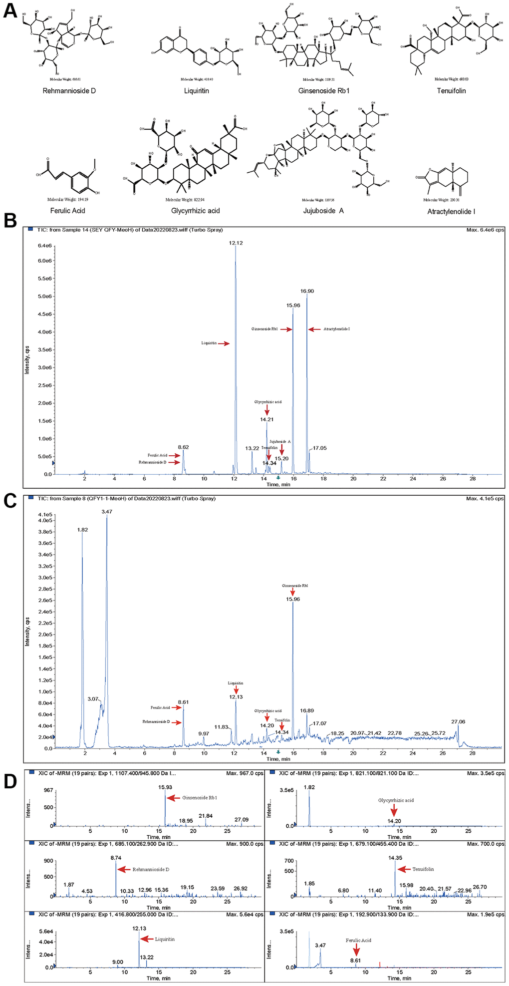As previously mentioned, QFY was prepared using both water and alcohol extraction to ensure the quality of the key components. The medicinal ingredients were combined and ground into a powder, which was then steeped for 1.5 hours in an 8-fold (v/w) 70% alcohol solution. The mixture was subjected to boiling for 0.5 hours and then simmered for an additional hour. The filtrate obtained after this process was collected. To extract any remaining components, the drug residue was subjected to another extraction process using water that had been saturated with 6-fold (v/w) 70% alcohol, following the same method. Concentrate the extract twice using a rotary evaporator. The drug residue was then extracted again using the same technique, first with 8-fold (v/w) and then with 6-fold (v/w) distilled water. The resulting water extract was added to the concentrated alcohol extract, which was heated until there was no longer any alcohol odor. The extract was then vacuum freeze-dried in a lyophilizer for two to three days, resulting in a freeze-dried QFY powder. From 100 g of raw materials, 48.8 g of lyophilized powder was obtained. Ginsenoside Rb1, atractylenolide I, rehmannioside D, ferulic acid, jujuboside A, tenuifolin, liquiritin and glycyrrhizic acid were utilized as standards for identifying the primary components of QFY to ensure quality control. In this experiment, the target compounds were separated by chromatography using a Sciex Qtrap6500+ triple quadrupole mass spectrometer liquid chromatograph on an Agilent Poroshell 120 EC-C18 4.6 × 150 mm, 4 μm liquid chromatography column. Mobile phase A was 5 mM ammonium acetate 0.1% formic acid solution, and phase B was 0.1% methanol formic acid. The column temperature was 30°C, the injection volume was 5 μl, and the flow rate was 0.8 ml/min. The gradient elution was 0–5.0 min, 95% A: 5% B; 5.0–15.0 min, 95% A: 5% B; 15.0–25 min, 5% A: 95% B; 25–25.1 min, 5% A: 95% B; 25.1–30 min, 95% A: 5% B. The mass spectrometry conditions were as follows: ion source parameters: ion source ESI; MRM mode, MRM parameters are shown in Table 2; spray voltage 5500 V; ion source temperature 550°C; curtain gas 35 psi; ion source gas 1 50 psi; ion source gas 2 50 psi; residence time 30 msec.