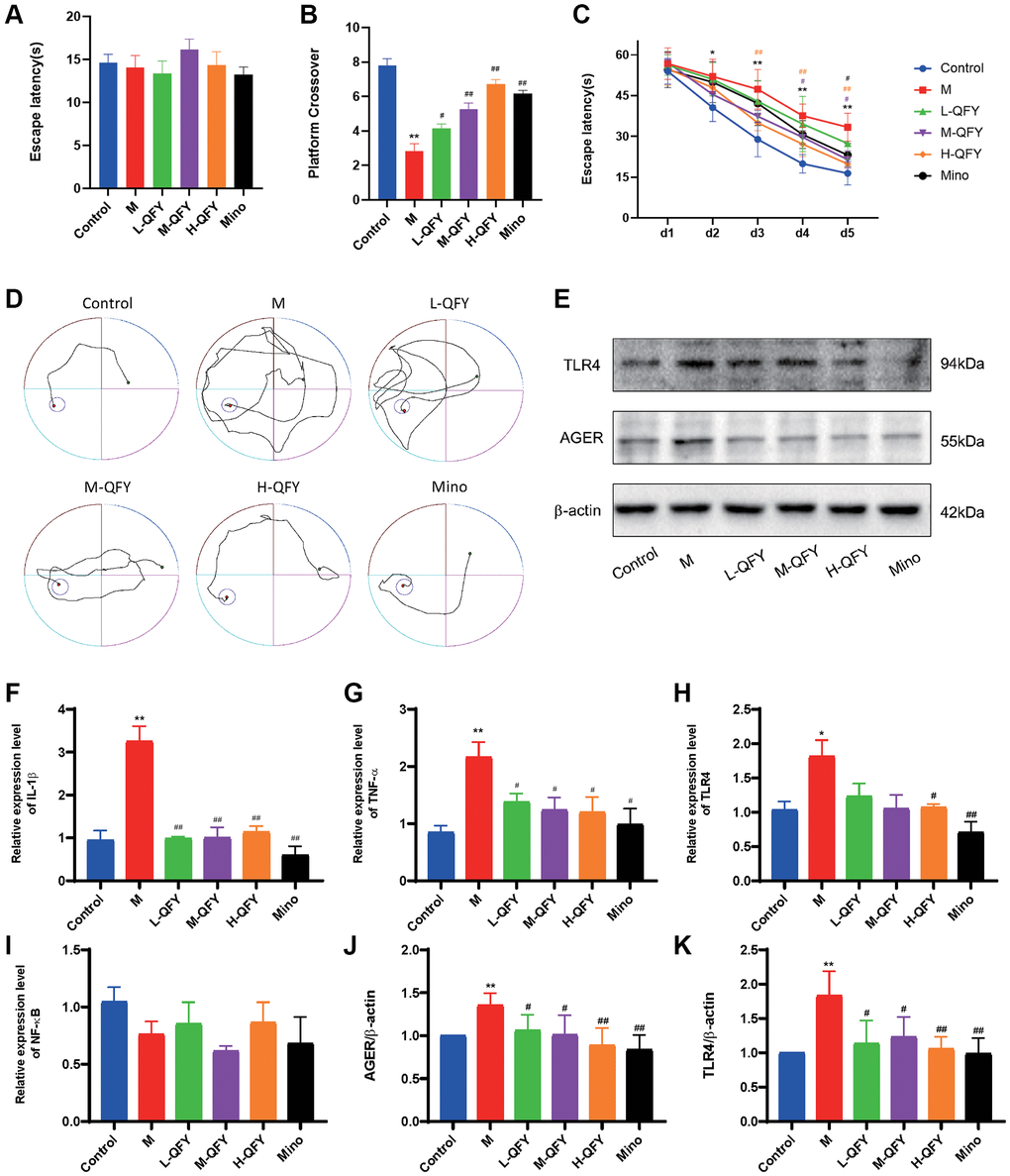 To further investigate the effect of QFY on the protein expression of AGER and TLR4 in the brains of AD model rats, we conducted protein expression analysis. The results revealed that there was a significant increase in the expression of AGER and TLR4 in the AD rats, as demonstrated in Figure 6E, 6J, 6K. However, both QFY and Mino interventions were effective in reversing this elevation. These results suggest that treatment with QFY and Mino may have a suppressive effect on the expression of AGER and TLR4 in the studied model.