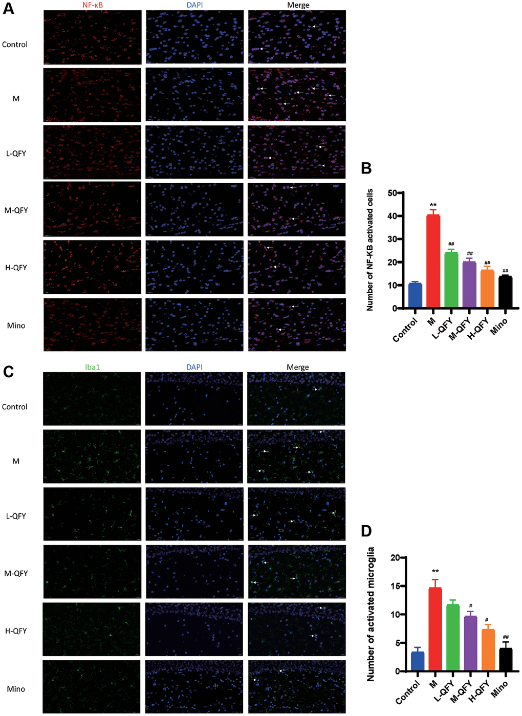 To further investigate the underlying mechanism of how QFY exhibits its anti-AD activities in the brain, we conducted an immunofluorescence analysis of Iba1 and NF-κB. Our results, as shown in Figure 7, demonstrated higher levels of NF-κB in the nucleus and Iba1 in the model group compared to the normal group. However, both QFY and minocycline were effective in reducing NF-κB expression in the nucleus and microglia activation in the hippocampal region of AD model rats. The results indicate that QFY may have a beneficial impact on AD by reducing microglia activation and NF-κB expression, further supporting its potential as a treatment option for AD.