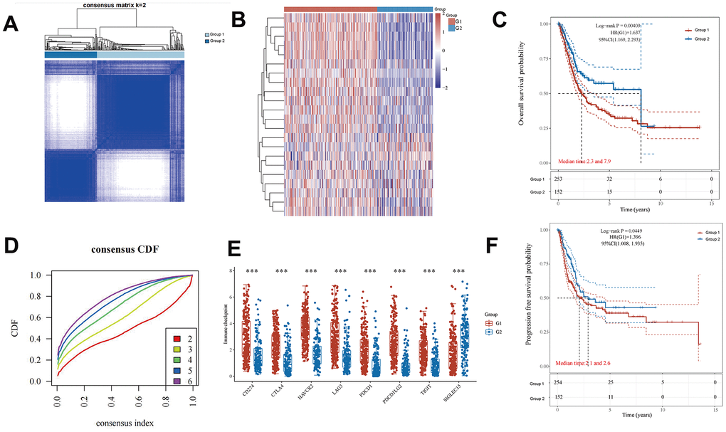The “ConsensusClusterPlus” R package (version 1.54.0) was employed to analyze the expression levels of selected regulators associated with EMT and energy metabolism in patients with BLCA. A maximum of six groups were defined, and this process was repeated 100 times, each time utilizing 80% of the total sample. Subsequently, the principal components were examined using the “ggplot2” R package for visualization.