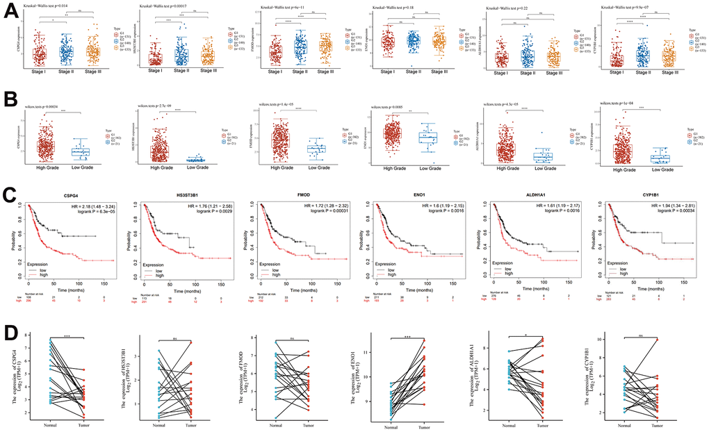 We analyzed the differential expression of six key genes associated with EMT and energy metabolism across distinct pathological stages of BLCA. The BLCA samples were categorized into three stages, comprising 131 cases in Stage I, 140 cases in Stage II, and 133 cases in Stage III. The results revealed significant differences in the expression of CSPG4 (p = 0.014), HS3ST3B1 (p = 0.00017), and FMOD (p = 6e-11) among the different BLCA pathological stages (Figure 5A). Subsequently, we examined the variations in the expression of these six key genes across different grades of BLCA, classifying the BLCA samples into two groups: high-grade BLCA and low-grade BLCA, with 382 cases in the former and 21 cases in the latter. The results demonstrated that HS3ST3B1, FMOD, CSPG4, ALDH1A1, CYP1B1, and ENO1 exhibited significantly higher expression levels in the high-grade BLCA group (Figure 5B). We further employed Kaplan–Meier analysis to assess the prognostic significance of these six key genes in BLCA samples, revealing that all six genes held statistical significance in predicting BLCA prognosis (p < 0.05) (Figure 5C). Lastly, paired sample analysis was conducted to investigate differences in the expression of the six key genes between tumors and their corresponding normal tissues. Among these genes, CSPG4, ENO1, and ALDH1A1 displayed statistically significant differences (Figure 5D). In summary, our comprehensive analysis highlighted that among the examined genes, only CSPG4 exhibited statistical significance across various aspects of BLCA, including immune infiltration, prognosis, pathological staging, grading, and paired sample analysis. Therefore, CSPG4 emerges as the most significant gene associated with EMT and energy metabolism, closely associated with immune infiltration and prognosis in BLCA.