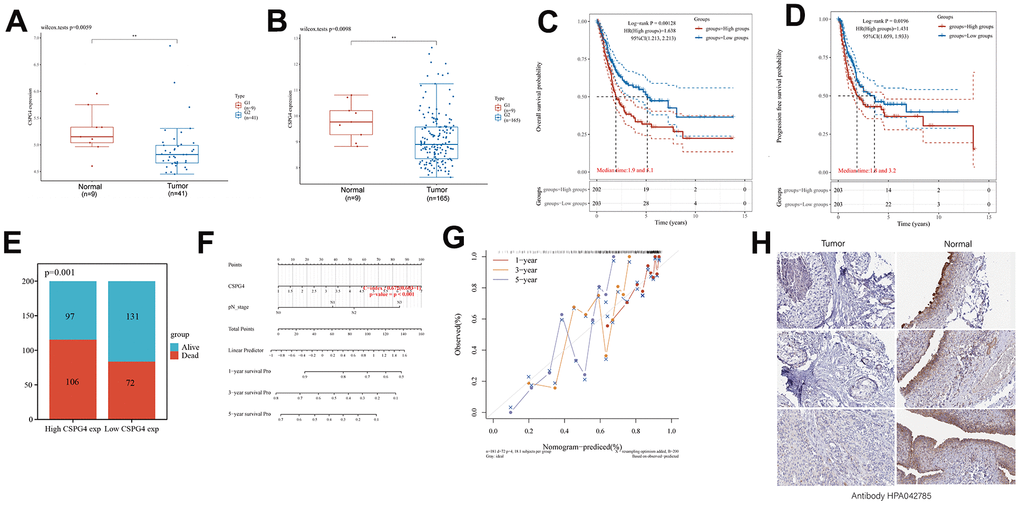 The results of our prior analysis illustrated that CSPG4 exhibits differential expression in both BLCA and normal tissues, as well as when compared to paired normal tissues. To further substantiate this differential expression of CSPG4 between BLCA and normal tissues, we conducted analyses utilizing the GSE3167 and GSE13507 datasets from the GEO database. These analyses consistently demonstrated significant differential expression of CSPG4 in BLCA compared to normal tissues, reinforcing the statistical significance of this observation (Figure 6A, 6B). Furthermore, we investigated the correlation between CSPG4 expression and OS as well as progression-free survival among patients with BLCA. The results revealed that patients with low CSPG4 expression exhibited significantly improved OS and progression-free survival rates compared to those with high CSPG4 expression. This suggests that elevated CSPG4 expression within BLCA is indicative of a poorer prognosis (Figure 6C, 6D). In the stacked bar chart in Figure 6E, a clear trend emerged, with a higher number of deaths and a lower number of survivors (n = 203) observed among patients with BLCA exhibiting high CSPG4 expression. Additionally, we constructed nomogram and OS nomogram models based on the results of a multivariate Cox regression analysis of CSPG4 expression. These models served to elucidate the impact of CSPG4 on the prognosis of patients with BLCA more comprehensively (Figure 6F, 6G). Finally, we conducted a differential analysis of CSPG4 protein expression between BLCA and normal tissues using the Human Protein Atlas website. This analysis revealed a significantly higher staining intensity of CSPG4 protein in normal tissues compared to BLCA tissues (Figure 6H).