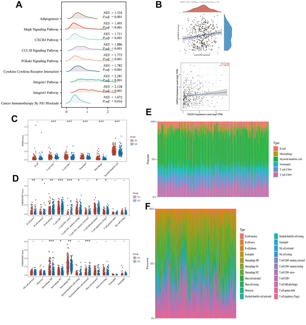 We performed GSEA to assess the enrichment patterns of CSPG4 in high- and low-expression groups of BLCA. The results of our analysis, visualized as a ridge plot, revealed a significant association between CSPG4 and “cancer immunotherapy by PD1 blockade” in the BLCA immune microenvironment. This underscores the significance of PD1 as a crucial target for BLCA immunotherapy owing to the interrelationship between CSPG4 and PD1 (Figure 8A). Subsequently, we examined the correlation between CSPG4 and PD1, finding a positive association in their expression levels (Figure 8B). Additionally, we explored variations in immune cell expression between the high and low CSPG4 expression groups using the TIMER and CIBERSORT algorithms. The results indicated that T cells, B cells, Natural Killer (NK) cells, macrophages, and monocytes were expressed in both groups, although without significant differences in expression levels (Figure 8C, 8D). Furthermore, we generated a heatmap illustrating the percentages of immune infiltrating cells in both groups, validating a positive correlation between CSPG4 and PD1 expression (Figure 8E, 8F). In summary, CSPG4 plays a pivotal role in the immune microenvironment of BLCA and holds substantial relevance to PD1 immunotherapy in patients with BLCA.