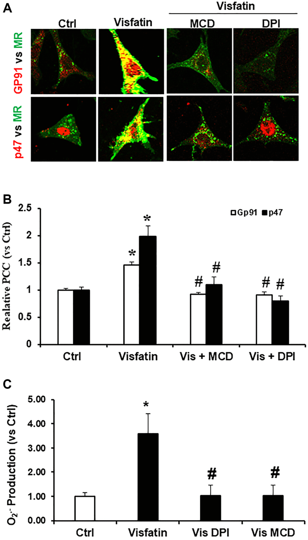 Visfatin stimulation induces colocalization of p47phox and gp91phox with MR clusters