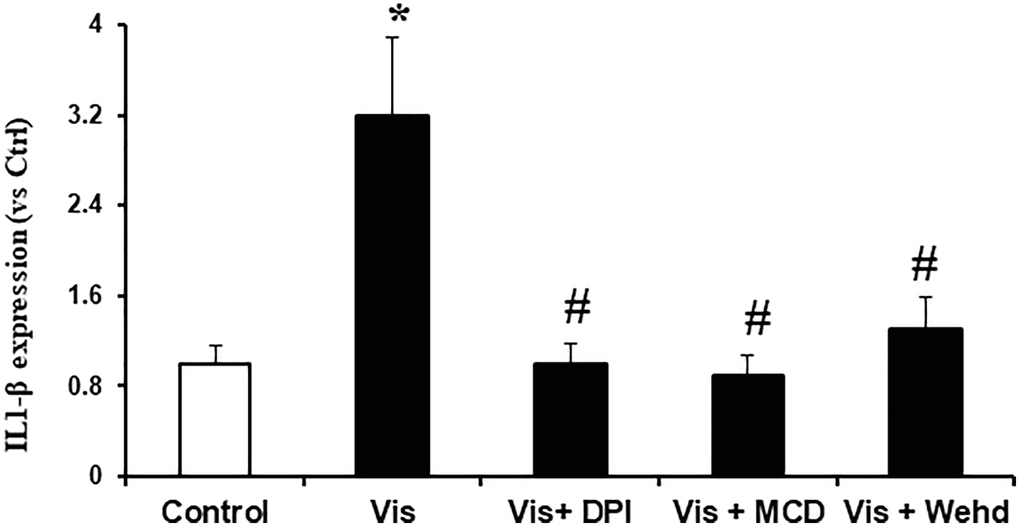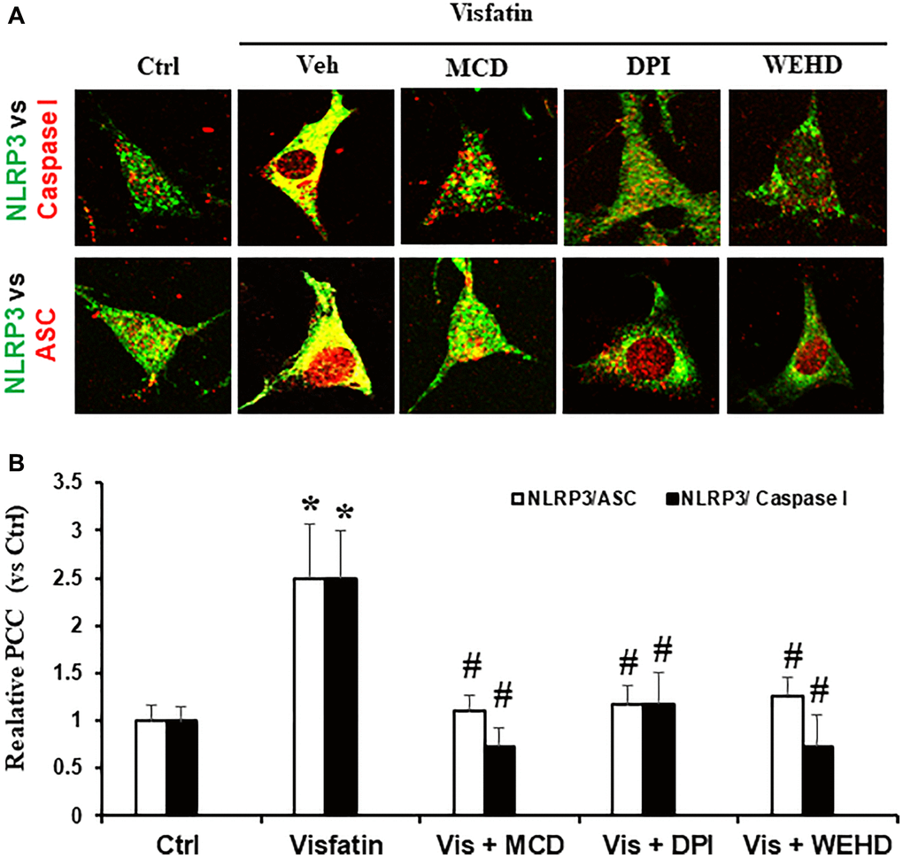 We sought to investigate the hypothesis that the activation of NADPH oxidase by visfatin exerts its effects by promoting the NLRP3 inflammasomes formation and activation, consequently contributing to podocyte injury. We investigated whether visfatin had the potential to initiate the assembly and activation of NLRP3 inflammasome complexes in cultured podocytes, by examining the co-localization of NLRP3 inflammasome components and the production of IL-1β. Our confocal microscopy images displayed increased co-localization of inflammasome molecules, as evidenced by the augmented yellow staining (yellow spots) in podocytes when stimulated with visfatin (Figure 2). Pre-treatment of podocytes with the MR disruptor MCD, the NADPH oxidase inhibitor DPI, or WEHD which is the caspase-1 inhibitor effectively hindered the aggregation of NLRP3 with ASC and NLRP3 with caspase-1 induced by visfatin, demonstrating the prevention of inflammasome formation in these cells. NLRP3 inflammasome complex formation leads to the cleavage of pro-caspase-1 protein into its bioactive form, which subsequently binds to and cleaves its substrates, including IL-1β. Corresponding to the confocal microscopy results of inflammasome complex formation, we observed a significant increase in IL-1β production following visfatin treatment (Figure 3). However, this enhanced IL-1β production was mitigated in podocytes pre-treated with the MR disruptor MCD, the NADPH oxidase inhibitor DPI, or the WEHD.