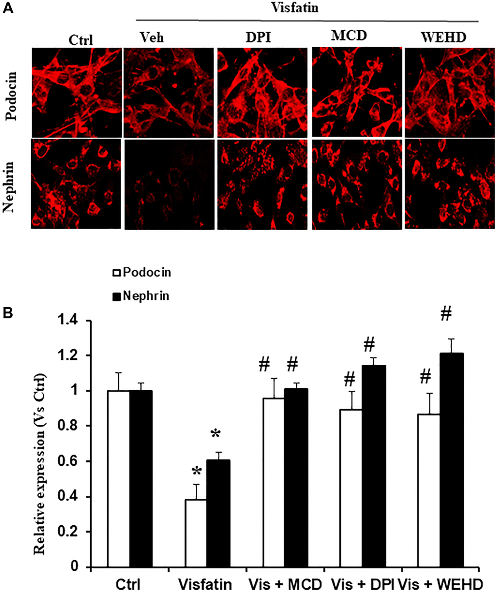 Specific markers indicative of podocytes, namely podocin and nephrin, exhibit a decrease in expression levels during podocyte injury [12, 16]. Therefore, we monitored the podocin and nephrin expression to evaluate the extent of podocyte damage. Notably, stimulation with visfatin led to a substantial reduction in the expression of nephrin and podocin, as evidenced by immunofluorescence studies, highlighting significant podocyte damage (Figure 4). Conversely, pre-treatment with the MR disruptor MCD, the caspase-1 inhibitor WEHD, or the NADPH oxidase inhibitor DPI served to protect the podocytes from damage. This was evident through the conserved podocin and nephrin expression levels to a normalized state, comparable to control levels (Figure 4). These outcomes strongly indicate that the redox signaling is mediated by the involvement of NADPH oxidase in the NLRP3 inflammasomes activation and the induction of podocyte dysfunction triggered by visfatin.