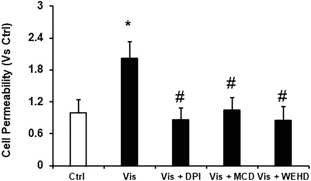 To delineate the role of visfatin in mediating the dysfunction of podocytes induced by visfatin, we investigated its impact on altering the podocyte monolayers permeability to FITC-dextran. Notably, visfatin treatment led to a significant elevation in podocyte monolayer permeability when assessed against the untreated podocytes. However, this visfatin-induced increase in the permeability of the podocyte monolayer was notably alleviated by prior treatments with the MR disruptor MCD, the NADPH oxidase inhibitor DPI, or the inflammasome disrupter (Caspase-1 inhibitor, WEHD) (Figure 6). These findings provide confirmation that visfatin-associated disruption of the podocyte monolayer operates through the involvement of MR-associated NADPH oxidase subunits.