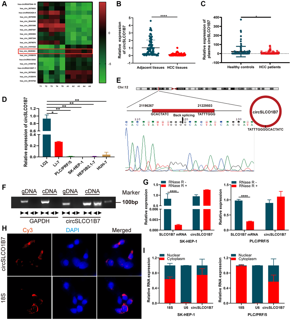 Similar to the HCC tissues, the expression of circSLCO1B7 was significantly lower in HCC cells (Li-7, PLC/PRF/5, SK-HEP-1, Hep3B1.7 and HuH-7) than in normal liver cells (LO2) (Figure 1D). According to the data from circBase (http://www.circbase.org/), circSLCO1B7 was a fragment of the parent gene SLCO1B7 and was located on chr12:21196267-21229503, which had undergone reverse splicing to form a closed ring structure with a length of 1138 nt. The qRT–PCR product detected in the tissues was sequenced, and the head-to-tail splicing sequence of circSLCO1B7 was consistent with the expected splicing site (Figure 1E). On this basis, to verify the ring structure of circSLCO1B7, we constructed convergent and divergent primers according to the sequence. Since cDNA and genomic DNA (gDNA) could both exhibit head-to-tail phenomena, gel electrophoresis of the amplified product showed that circSLCO1B7 could be expressed in cDNA but not in gDNA (Figure 1F). To verify the stability of circSLCO1B7, qRT–PCR results showed that the expression of the linear parent gene SLCO1B7 was significantly inhibited in HCC cells treated by RNase R enzyme, while the expression of circSLCO1B7 remained basically unchanged. It was confirmed that circRNAs were not degraded by the RNase R enzyme (Figure 1G). With 18S as the control group, FISH assay (Figure 1H) and nuclear and cytoplasmic assay (Figure 1I) showed that most of circSLCO1B7 were located in cytoplasm.
