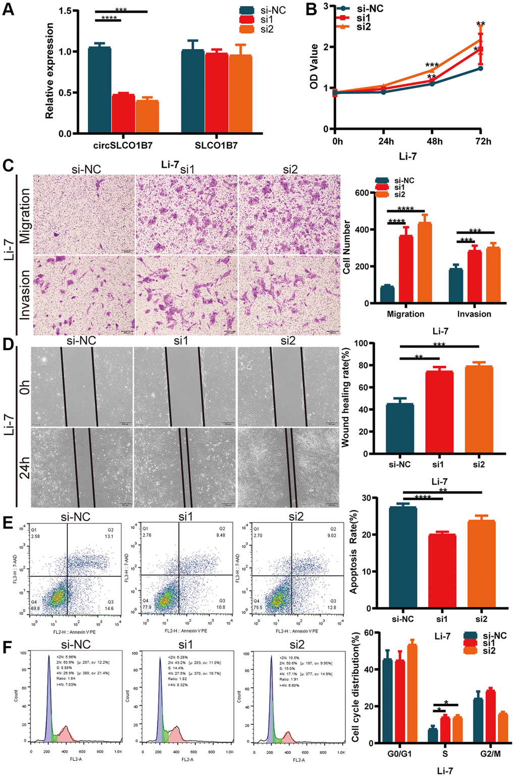 Next, we determined whether knockdown of circSLCO1B7 had the opposite biological function, and we designed two siRNAs (si1 and si2). Based on its expression in HCC cells, we transfected siRNAs into Li7 cells. qRT–PCR showed that the knockdown efficiency was satisfactory (Figure 3A). CCK-8 assays also showed that the proliferation of HCC cells increased after transfection with siRNAs (Figure 3B). Similarly, after knockdown of circSLCO1B7, the migration and invasion abilities of Li7 cells was enhanced compared with that of the normal control group according to the results of Transwell assays (Figure 3C) and wound healing assays (Figure 3D). Knockdown of circSLCO1B7 reduced the cell apoptosis rate and arrested the cell cycle in the G0/G1 phase, as determined by flow cytometry (Figure 3E, 3F).