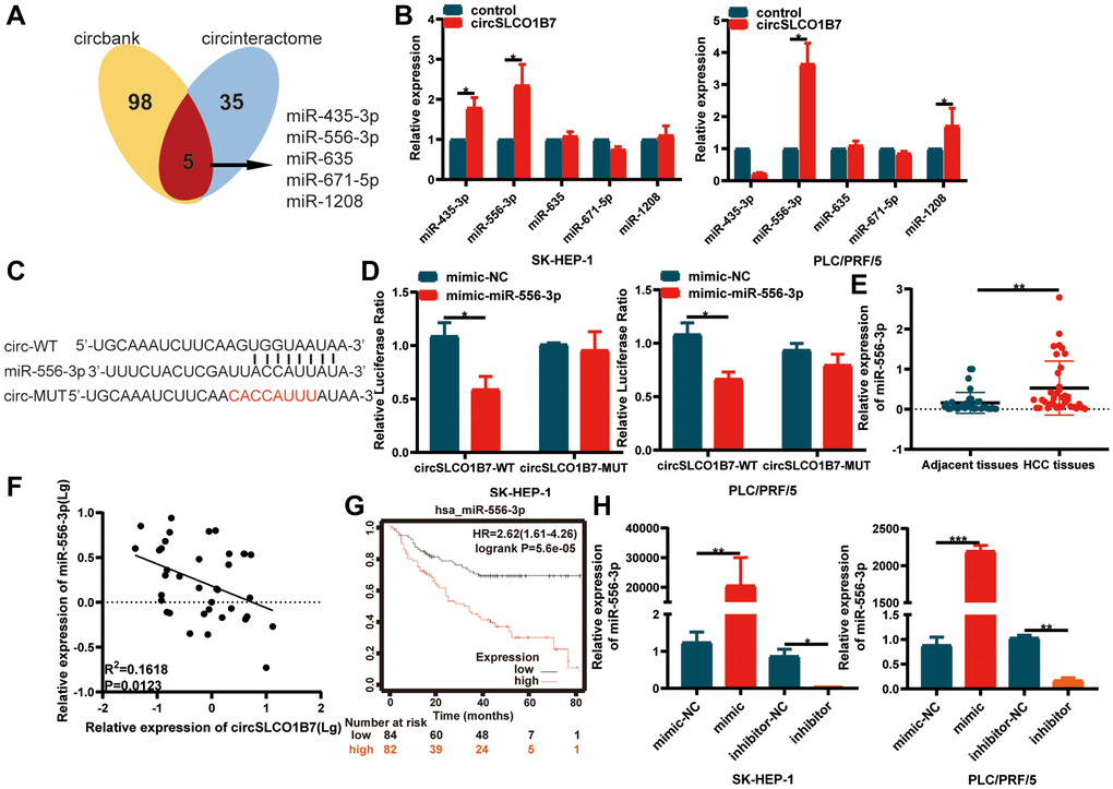 Furthermore, we confirmed that the expression of miR-556-3p was higher in HCC tissues than in adjacent normal tissues (Figure 4E). In addition, we analyzed the correlation between circSLCO1B7 and miR-556-3p expression levels in HCC tissues. The miR-556-3p expression level was negatively correlated with circSLCO1B7 expression level (Figure 4F). To study the clinical value of miR-556-3p, we analyzed the data from Kaplan–Meier plotter (http://kmplot.com/analysis/). The median expression level of miR-556-3p in 166 HCC patients was used as the cut-off value, the survival rate of the low miR-556-3p group was obviously better than that of the high miR-556-3p group (Figure 4G). Thus, we designed miR-556-3p mimic and inhibitor and identified the transfection efficiency by qRT–PCR (Figure 4H). All these experiments showed that circSLCO1B7 could bind with miR-556-3p and act as a miR-556-3p sponge.
