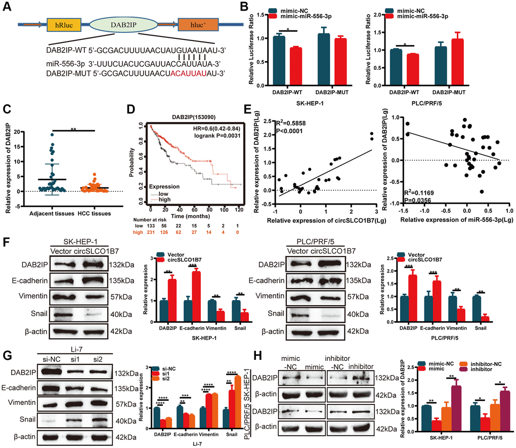 EMT is a hallmark of migration that allows polarized epithelial cells to acquire a stem-cell like mesenchymal phenotype, which contributes to cancer metastasis. Western blot analysis was implemented to compare the expression of EMT-related proteins. When circSLCO1B7 was overexpressed, the expression levels of DAB2IP and epithelial biomarker E-cadherin proteins were also significantly increased, while the expression levels of mesenchymal biomarkers Vimentin and Snail were decreased (Figure 5F). With the knockdown of circSLCO1B7, the expression level of E-cadherin protein was reduced, while the expression levels of Vimentin and Snail were increased (Figure 5G). To further evaluate the effect of miR-556-3p on DAB2IP expression, miR-556-3p mimic or inhibitor was transfected into SK-HEP-1 and PLC/PRF/5 cells. The results of Western blot showed miR-556-3p mimic decreased the expression level of DAB2IP while miR-556-3p inhibitor increased the expression level of DAB2IP (Figure 5H).