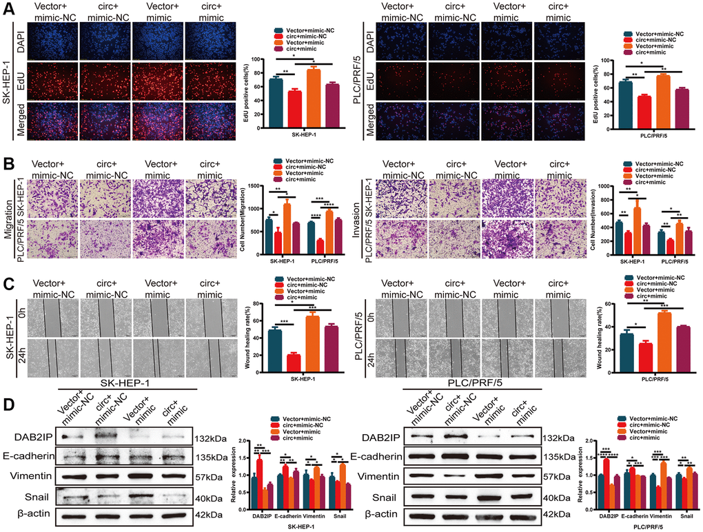 What’s more, we co-transfected HCC cells with circSLCO1B7-overexpressing plasmids and the miR-556-3p mimic. We constructed four groups: Vector+mimic-NC, circ+mimic-NC, Vector+mimic and circ+mimic. EdU assays, Transwell assays and wound healing assays were performed. The results showed that the proliferation, invasion and migration abilities of HCC cells were decreased in circ+mimic-NC group and increased in the Vector+mimic group (Figure 6A–6C). The miR-556-3p mimic could antagonize the effect of circSLCO1B7 in inhibiting tumor metastasis. Western blot analysis showed that overexpression of circSLCO1B7 increased the expression levels of DAB2IP and E-cadherin proteins and reduced the expressions levels of Vimentin and Snail proteins. Moreover, miR-556-3p mimic could reverse this effect (Figure 6D). Thus, these data indicated that circSLCO1B7 could affect tumor metastasis by sponging miR-556-3p to regulate the expression of DAB2IP.