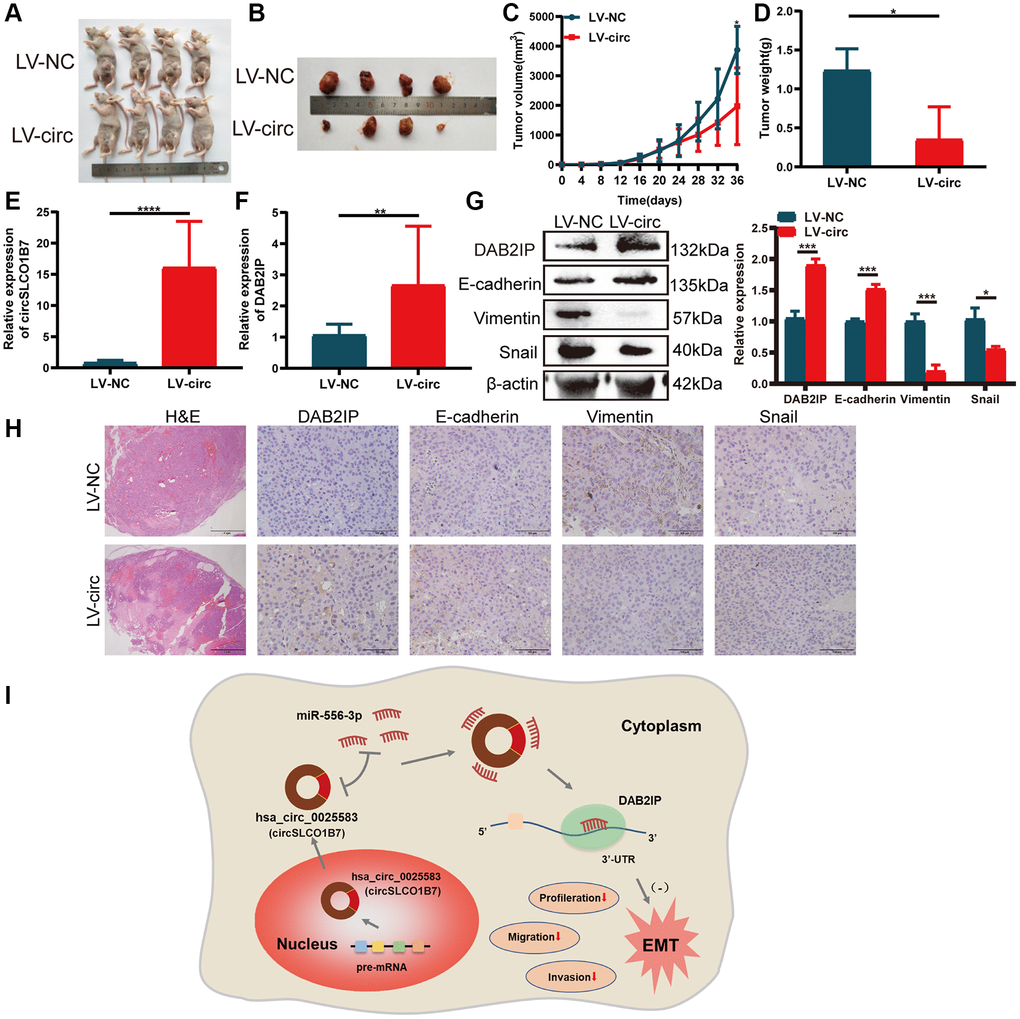 To study the effect of circSLCO1B7 on the growth of HCC, we established the model of subcutaneous tumorigenesis. Stably transfected lentiviral vectors (LV-NC and LV-circ) were injected into the armpit of mice. A total of 8 mice were divided to LV-NC group and LV-circ group. 36 days later, the tumors in the LV-circ group were significantly smaller than those in the LV-NC group (Figure 7A, 7B). Overexpression of circSLCO1B7 reduced both the volume and weight of the tumors (Figure 7C, 7D). The expression levels of circSLCO1B7 and DAB2IP were increased in the LV-circ group (Figure 7E, 7F). H&E staining revealed that there were few tumor foci of HCC in the LV-circ group compared to the LV-NC group. IHC and Western blot results showed that the expression levels of Vimentin and Snail were reduced and the expression levels of DAB2IP and E-cadherin were enhanced in the LV-circ group (Figure 7G, 7H). Thus, we concluded that overexpression of circSLCO1B7 inhibited the growth of HCC in vivo.