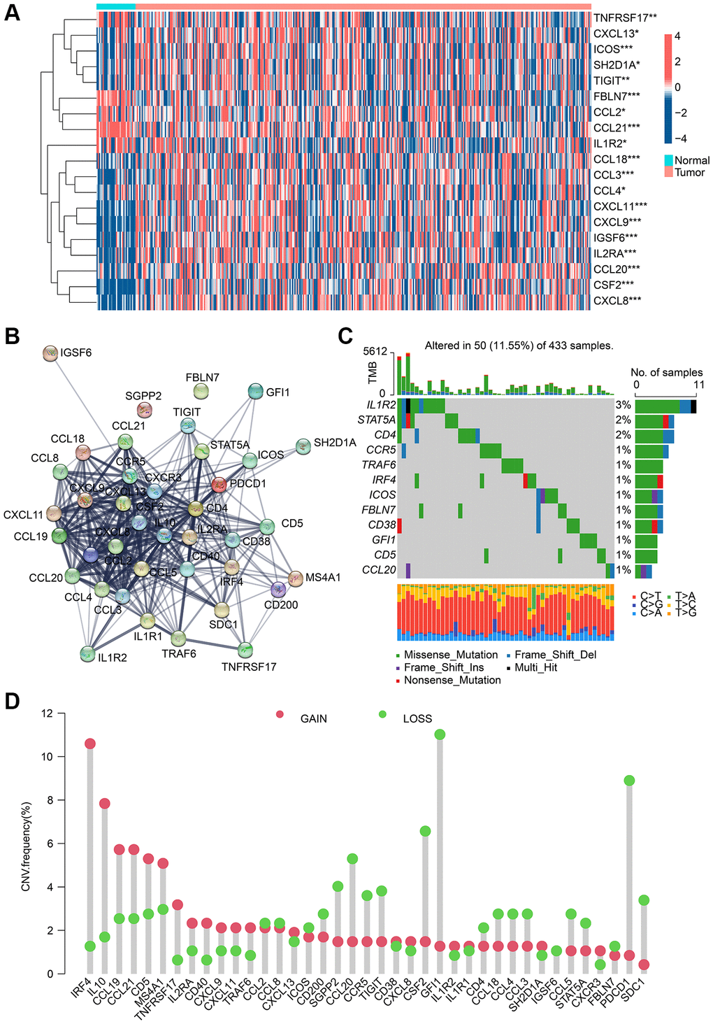 In this study, we found that most TLS-RGs were altered in GC patients in terms of expression and variation, especially IL-1R2, STAT5A and CD4 with higher mutated frequency. Interleukin-1 receptor type II (IL-1R2), as a negative regulator of the IL-1 system, plays a key role in many inflammatory diseases and cancers [28]. The signal transducer and activator of transcription 5A (STAT5A) can influence the major regulators of cell growth and regulate tumorigenesis [29]. CD4 is mainly expressed by helper T cells and has a crucial role in human immunity [30]. These genes, once altered, may be able to influence tumorigenesis, immune landscape, and immune escape.