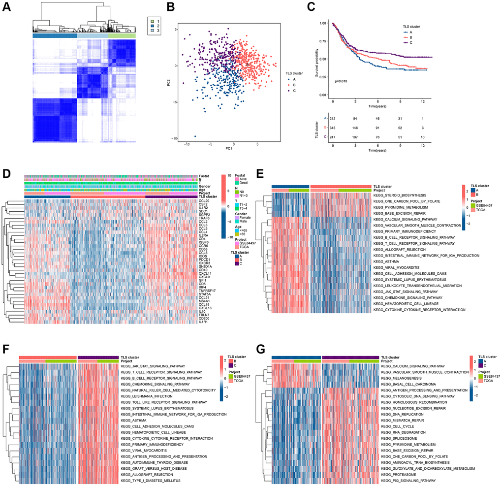To clarify the role of TLS-RGs in GC, we performed unsupervised clustering analysis of GC patients based on the expression of 39 TLS-RGs. Good results were obtained when the number of subgroups was 3 (Figure 2A). PCA results showed the separation of the three clusters from each other (Figure 2B). The KM curves showed that the survival curves were different among three clusters, with cluster C being the best and cluster A or cluster B being worse (Figure 2C). The expression heat map of TLS-RGs in three clusters is shown in Figure 2D, and it should be noted that the expression of TLS-RGs in cluster B is the most specific. To understand the reasons for the survival differences between these three clusters, differential analysis was performed for two of these three clusters and the biological signals involved in the differentially expressed genes were identified by enrichment analysis (Figure 2D–2G). The results showed that immune-related pathways were more enriched in cluster A and cluster C, and cluster C was higher than cluster A (Figure 2D–2G). This suggests that immunity is involved in the regulatory of TLS-RGs in GC.