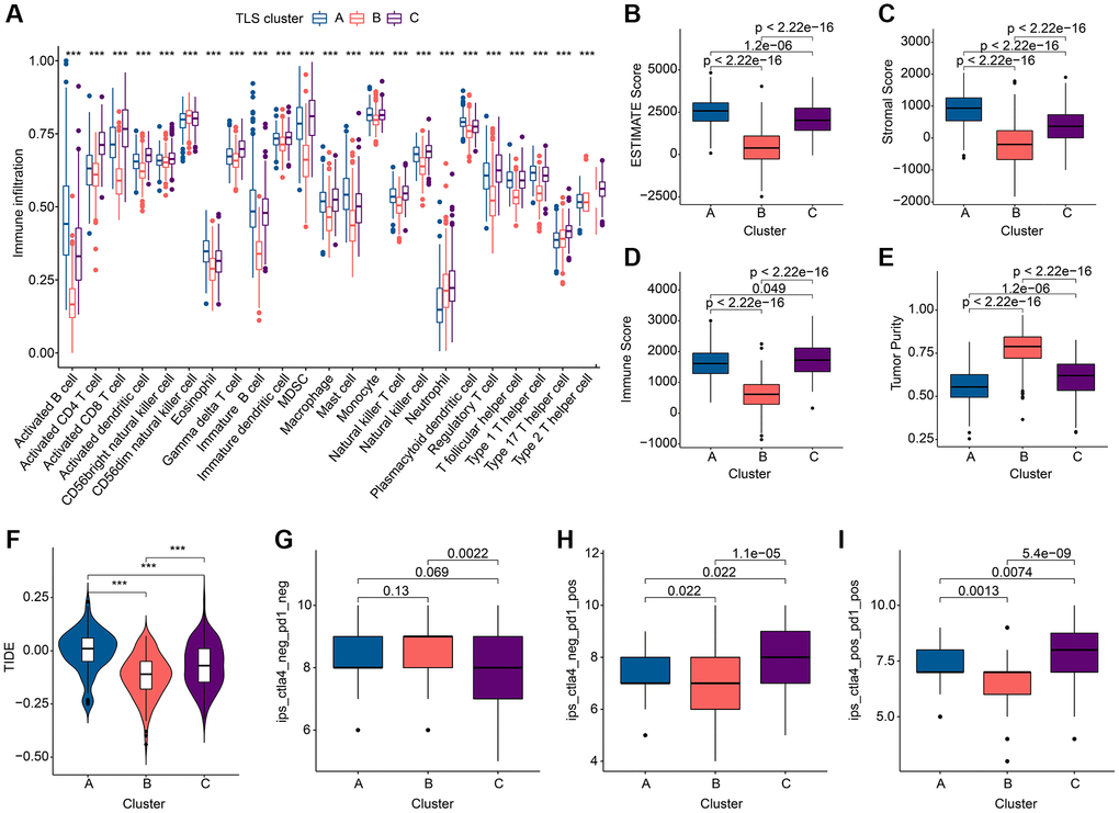 To investigate the relationship between the altered immune environment and TLS subgroups, we applied multiple immune algorithms to assess the immune landscape of the samples. ssGSEA results showed significant differences in the abundance of 23 immune cell in the 3 clusters (Figure 3A). It is worth noting that the infiltration of Neutrophils and Type 17 T helper cells in TLS cluster A or TLS cluster C is different from other immune cells. And cluster C had a higher ESTIMATE score and higher immune score but lower tumor purity compared to cluster B (Figure 3B–3E). TIDE results also pointed to a better immune response in cluster C (Figure 3F). In addition, we performed immunotherapy analysis on these 3 clusters and found that cluster C showed a greater response to anti-PD-1/anti-PD-1+ anti-CTLA4 treatment (Figure 3G–3I). In conclusion, the better survival of cluster C is closely related to its own immune environment.