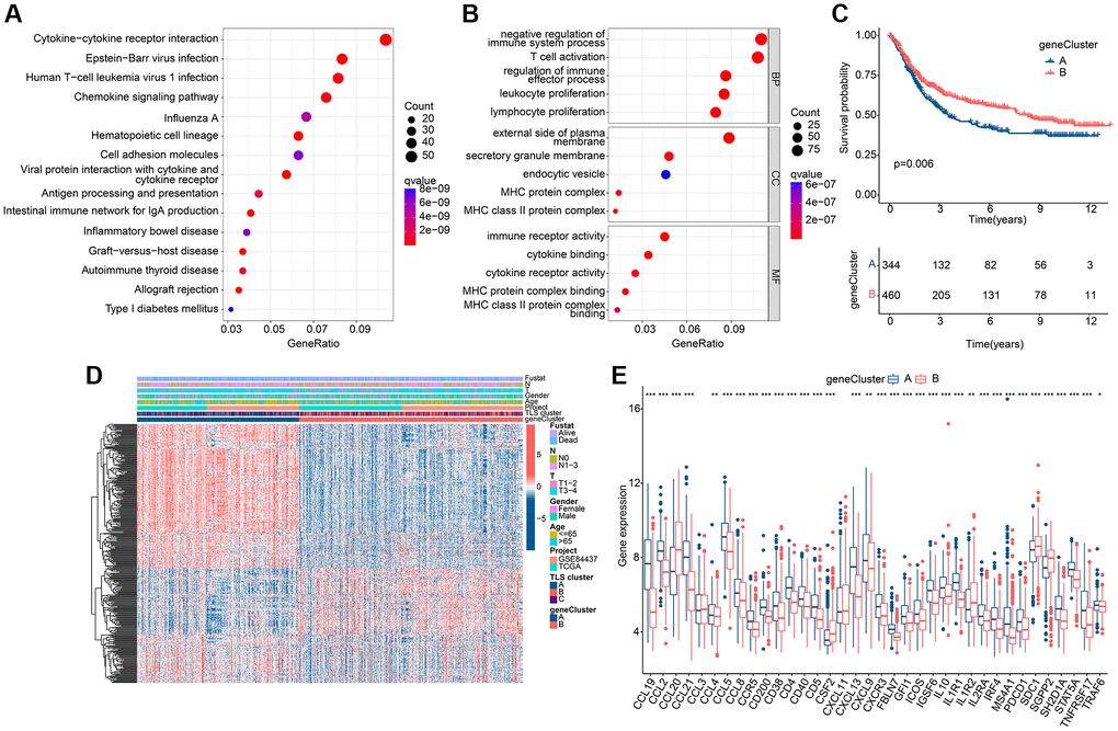 To garner subgroups marked by more conspicuous distinctions in prognostic outcomes, a reiteration of consensus clustering analysis was executed upon a cohort of GC patients. This secondary consensus clustering analysis was undertaken with the intention of amplifying the repertoire of DEGs, with a specific focus on identifying those that bear relevance to prognosis. The overarching objective herein was to refine the construction of a more robust prognostic risk model. Subsequently, a compendium of common DEGs was discerned within the context of TLS clusters through the adept utilization of the “limma” computational package. Thereafter, a meticulous enrichment analysis was conducted, yielding pertinent insights into the functional implications of these genes (Supplementary Table 2). These co-DEGs were found to be mainly enriched in the biological functions of the immune process (Figure 4A, 4B), suggesting that TLS-RGs-mediated alterations in the immune process are critical for the regulation of GC. Further, the role of co-DEGs in GC was further discussed by dividing patients into different genetic subgroups based on the expression of co-DEGs using a consensus clustering approach. The results showed that the optimal grouping results could be obtained when the number of subgroups was 2. The KM curves indicated that there was a significant difference in prognosis between the two gene clusters, with gene cluster B having a better prognosis than gene cluster A (Figure 4C), and the difference was greater than that of the TLS cluster (Pgene cluster = 0.006 < PTLS cluster = 0.018). Expression heat map of co-DEGs is shown in Figure 4D, and it is clear that their expression is altered in these two gene clusters. We also analyzed the expression of TLS-RGs between these two gene clusters and the results showed that the expression of most TLS-RGs differed and that the expression of TLS-RGs was higher in gene cluster A than in gene cluster B (Figure 4E). This indicates that TLS-RGs in gene clusters appear significantly different.