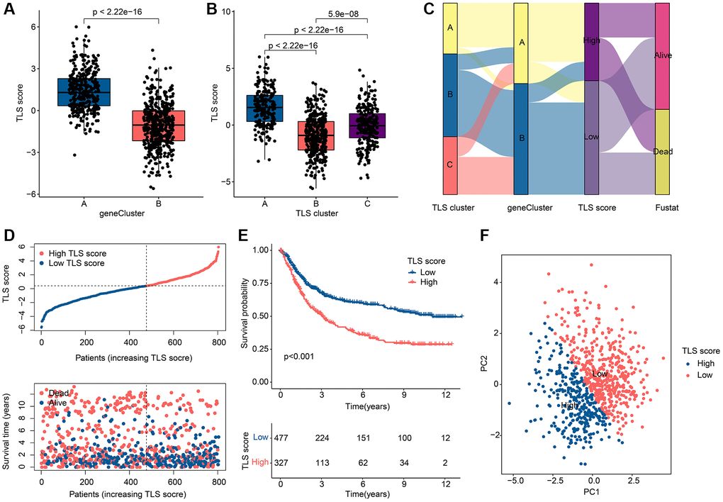 In pursuit of enhanced precision in forecasting both OS and treatment responsiveness among GC patients, a TLS scoring framework was meticulously crafted, leveraging the outcomes of Principal Component Analysis (PCA) applied to gene clusters. This strategic development seeks to furnish a robust predictive tool capable of furnishing more refined prognostic and treatment response insights for the benefit of GC patient care. As shown in Figure 5A, 5B, TLS scores differed in either gene clusters or TLS clusters. Note that TLS scores are highest in gene cluster A and TLS cluster A, which indicates that TLS scores are associated with immune regulation. Based on the TLS score, the optimal threshold was selected and the patients were divided into a low TLS score group and a high TLS score group. The distribution of GC patients among TLS clusters, gene clusters and TLS score clusters is shown in Figure 5C. The scatter plot showed that GC patients in the low TLS score group had a longer survival time (Figure 5D). GC patients in the low TLS score group tended to have better OS (Figure 5E). PCA results showed that patients with different TLS scores were separated from each other (Figure 5F).