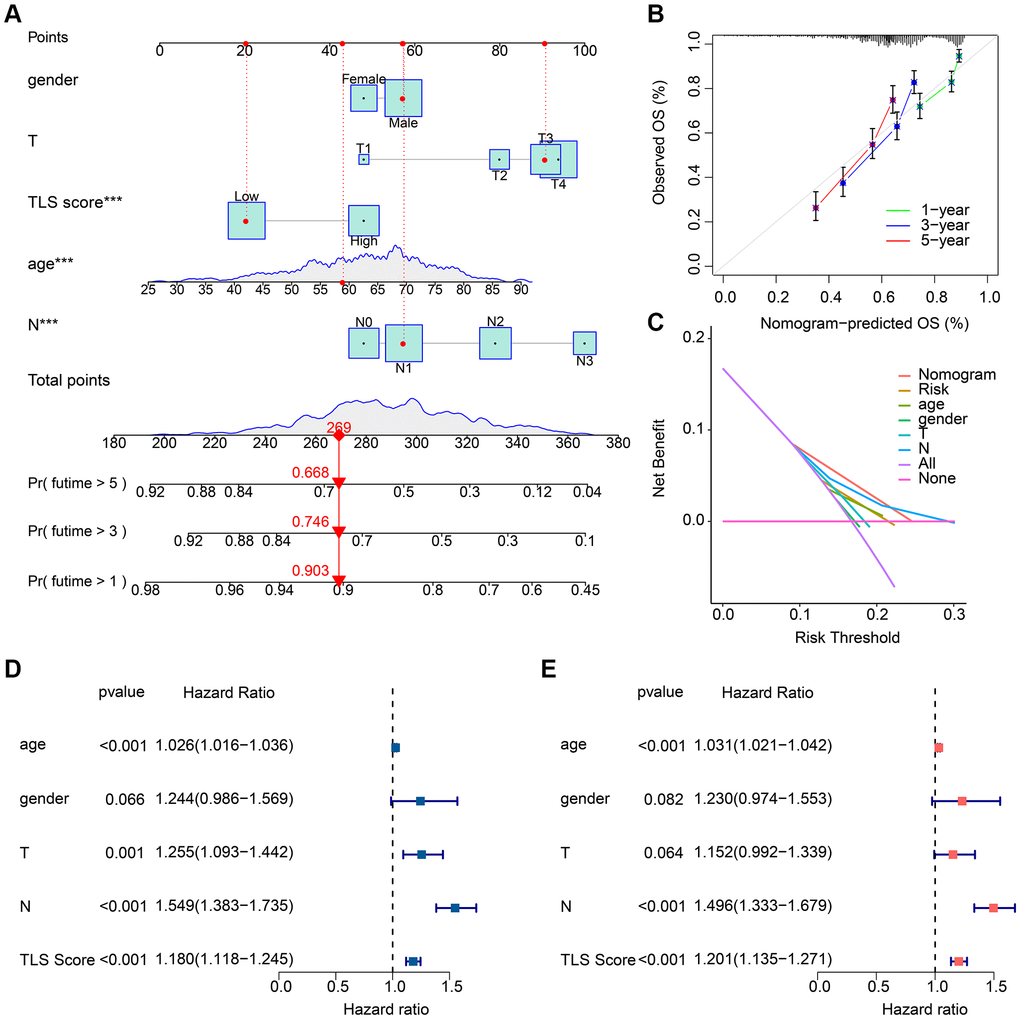 In order to accurately predict the prognosis of GC patients, we constructed a prognostic nomogram based on clinical characteristics and TLS scores (Figure 6A). Concordance index (C-index) results showed that the nomogram had good prognostic ability (Figure 6B). The decision curves showed that the nomogram was more accurate in predicting OS of GC patients than other clinical characteristics or TLS scores (Figure 6C). We further assessed the predictive independence of clinical characteristics and TLS scores by univariate and multifactorial Cox regression. The results showed that age (hazard ratio (HR) = 1.026, p < 0.001), T (HR = 1.255, p = 0.001), N (HR = 1.549, p < 0.001) and TLS score (HR = 1.180, p < 0.001) were associated with OS in GC patients, whereas age (HR = 1.031, p < 0.001), N (HR = 1.496, p < 0.001) and TLS score (HR = 1.201, p < 0.001) were able to serve as independent prognostic factors for GC patients (Figure 6D, 6E).