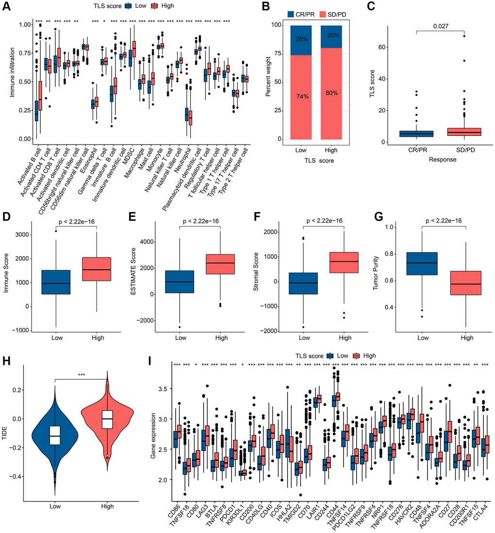 The abundance of 23 immune cells in the TLS score subgroups was analyzed by ssGSEA, and the results showed that there were significant differences in the distribution of the other 20 immune cells in different TLS scoring groups, except for CD56dim natural killer cell, Type 17 T helper cell and Type 2 T helper cell (Figure 7A). As shown in Figure 7B, 7C, SD/PD group had higher TLS scores. ESTIMATE results indicated that the high TLS score group had higher ESTIMATE score, immune score as well as lower tumor purity (Figure 7D–7G). Notably, there was more potential for immune escape in the high TLS score group due to the higher TIDE score in the high TLS score group compared to the low TLS score group (Figure 7H). In the analysis of ICP, we found that the expression of ICP was higher in the high TLS score group than in the low TLS score group, with the exception of HHLA2 (Figure 7I). In conclusion, we found significant immunological differences between subgroups of TLS score groups, with patients in the low TLS score group receiving immunotherapy with better outcomes than the high TLS score group.