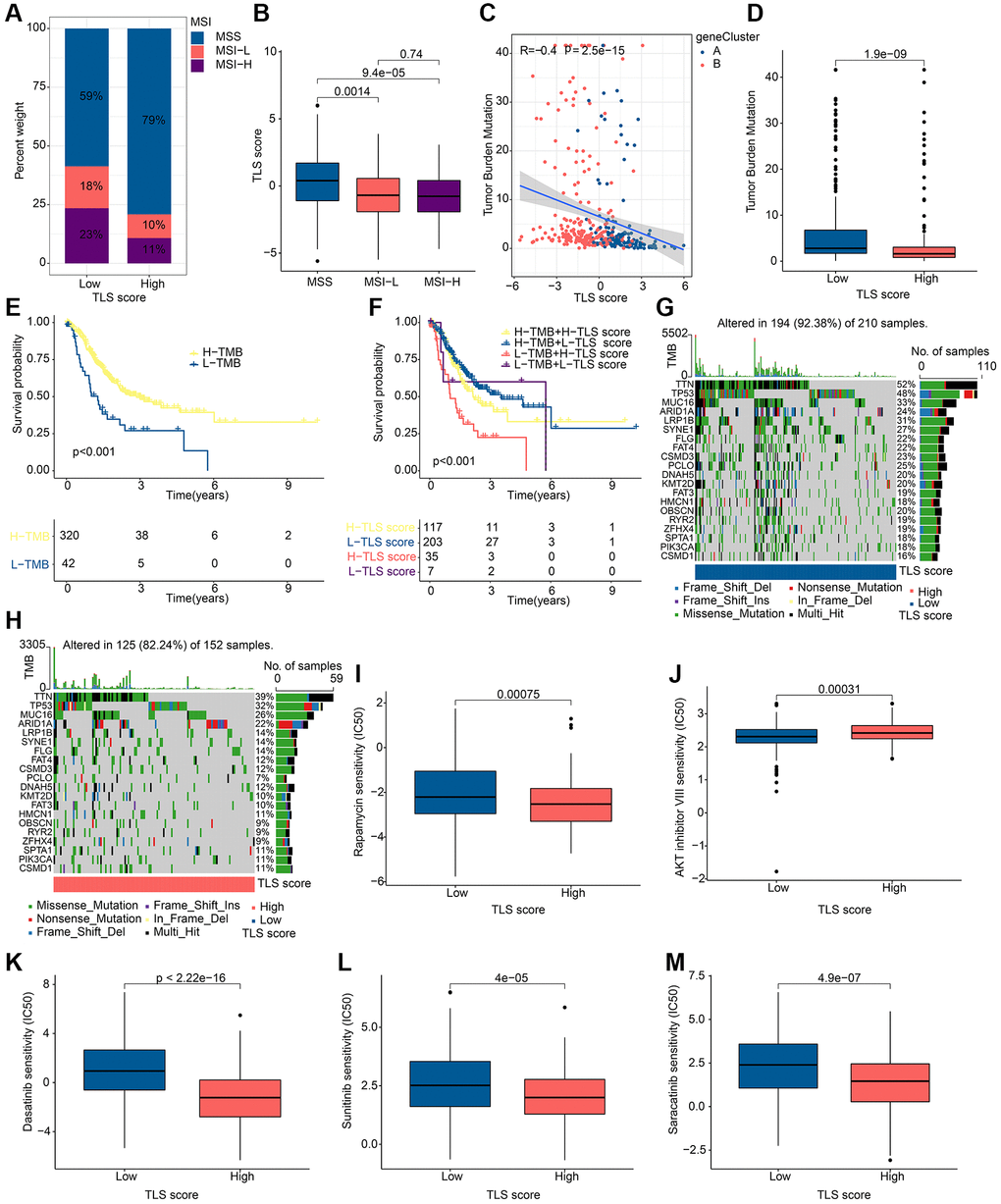 Microsatellite Instability (MSI) is considered as one of the important indicators of tumor immune response. In our study, patients in the low TLS score group were associated with MSI-L and MSI-H, while patients in the high TLS score group were associated with MISS (Figure 8A, 8B). Tumor mutation burden (TMB) can help predict patient response to immunotherapy. In our study, TMB was negatively correlated with TLS score (Figure 8C). Notably, TMB was higher in the low TLS score group than in the high TLS score group (Figure 8D), indicating that patients in the low TLS score group had a better immunotherapy response. Subsequently, we performed survival analysis on patients with different TMB, and the results showed that patients with high TMB tended to have better OS (Figure 8E). Further combined with the TLS score, patients with low TLS score accompanied by high TMB had the best prognosis (Figure 8F). The results of somatic mutation analysis for TLS score showed that the incidence of mutations in TTM, TP53, MUC16 and ARID1A were all higher than 20%, and it should be noted that the incidence of mutations in these genes was higher in low TLS score than in high TLS score (Figure 8G, 8H). These results suggest that TLS-RGs can influence the response to tumor immunotherapy. Drug sensitivity can reflect the patient’s response to drug therapy, and drug sensitivity analysis for TLS score was performed in our experiments. The results showed that Rapamycin, Dasatinib, Sunitinib and Saracatinib had a higher IC50 in the low TLS score group of patients, in contrast to AKT inhibitor VII (Figure 8I–8M). In conclusion, TLS-RGs was also associated with drug sensitivity in GC patients.
